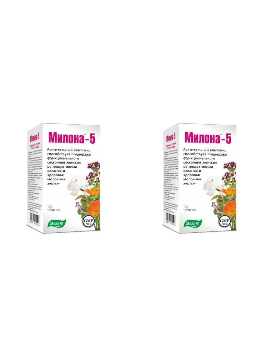 Milona-5 (100 tablets, 0.5g) is a general tonic for women with a predisposition to and early symptoms of mastopathy and inflammatory diseases of the genital area. Oregano, burdock, peony, golden root, licorice, calendula, kelp, and silicon oxide are included. Sold through pharmacies, specialty stores, and retail outlets as a dietary supplement and additional source of flavonoids.