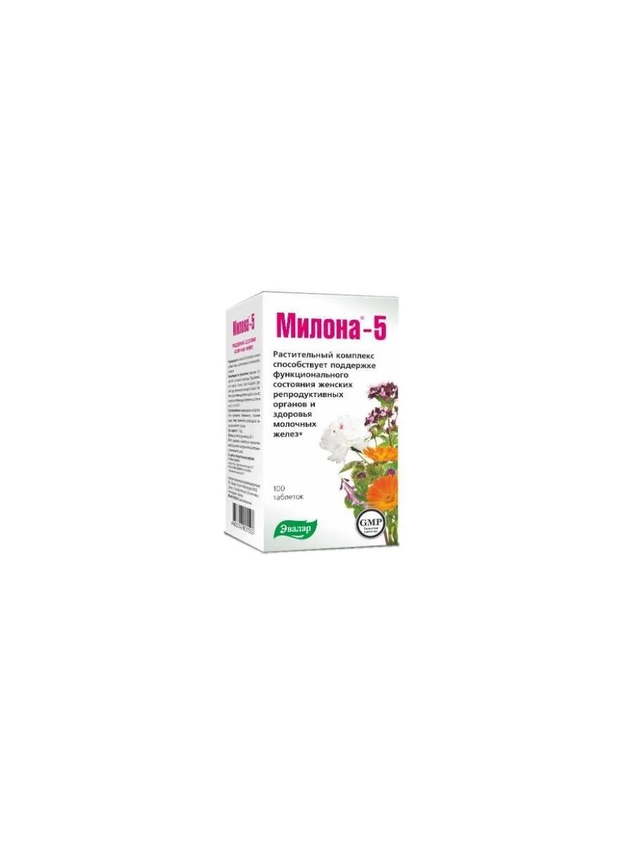 Milona-5 (100 tablets, 0.5g) is a general tonic for women with a predisposition to and early symptoms of mastopathy and inflammatory diseases of the genital area. Oregano, burdock, peony, golden root, licorice, calendula, kelp, and silicon oxide are included. Sold through pharmacies, specialty stores, and retail outlets as a dietary supplement and additional source of flavonoids.