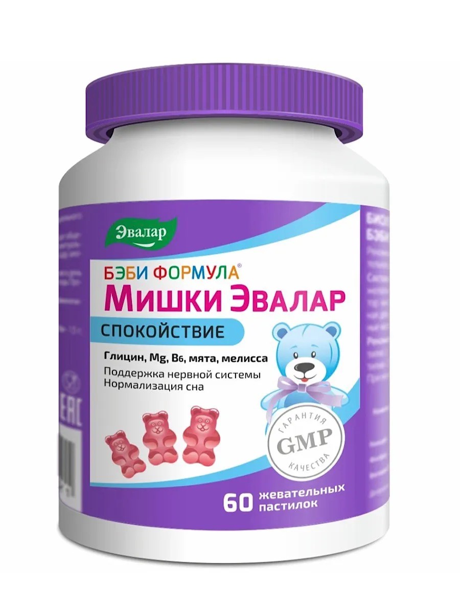 Бэби Формула Мишки Эвалар Спокойствие с магнием, витамином В6 и глицином - уникальное средство, способное успокоить вашего ребенка, уменьшить возбудимость и тревогу. Эти мармеладные пастилки со вкусом клубники разработаны специально для детей с 3 лет и могут справиться с характерными проявлениями гиперактивности (неусидчивость, импульсивность, рассеяность). В составе детских витаминов «Мишки Эвалар Спокойствие» - тщательно подобранные компоненты, включая глицин, магний и витамин B6, экстракты мелиссы и мяты. Эти ингредиенты поддерживают нервную систему ребенка при повышенных нагрузках, способствуют повышению концентрации внимания и усидчивости. Глицин способствует уменьшению беспокойства, снятию стресса, улучшению когнитивной функции, помогая вашему ребенку сосредоточиться, улучшить память и способность концентрироваться, а также помогает предотвратить возникновение расстройств нервной системы у ребенка, применяется для сна. Магний играет важную роль в поддержании здоровья детского организма. Его дефицит может вызывать раздражительность, тревожность, нарушения сна и другие проблемы. «Мишки Эвалар Спокойствие» с магнием для детей может восстановить нормальный уровень этого микроэлемента и обеспечить вашему ребенку спокойствие и расслабление, помогает для сна. Экстракты мелиссы и мяты обладают мягким успокаивающим, расслабляющим и седативным действием на организм. «Мишки Эвалар Спокойствие» произведены по стандарту GMP и не содержат искусственных красителей, ароматизаторов, консервантов и глютена, что делает их безопасным выбором для вашего ребенка. Подарите вашему ребенку спокойствие, улучшенную концентрацию внимания и здоровый сон с помощью «Мишки Спокойствие». Первые и единственные Мишки для спокойствия ребятишек! Способ применения: Детям от 3 до 7 лет – по 1 жевательной пастилке 1 раз в день во время еды, детям старше 7 лет – по 1 жевательной пастилке 2 раза в день во время еды. Продолжительность приема – 1-2 месяца. При необходимости прием можно повторить.