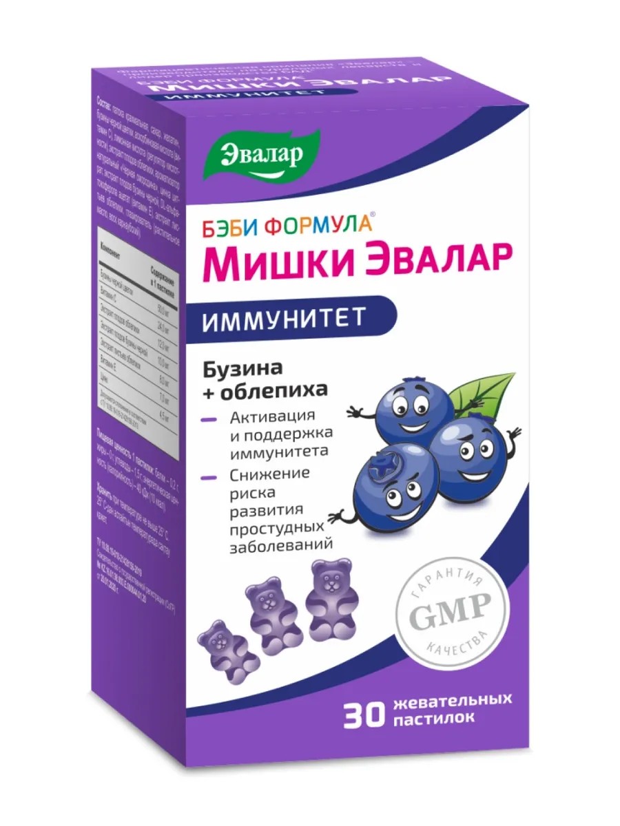 Бэби Формула Мишки Иммунитет от компании Эвалар - это биологически активная добавка (БАД) к пище – первые мармеладные пастилки с бузиной и облепихой для активации и поддержки детского иммунитета. Рекомендуется детям от 3-х лет до старшего подросткового возраста. Комплекс содержит экстракты бузины и облепихи, которые обладают иммуностимулирующим действием и в комплексе с витаминами С, Е и цинком способствует повышению защитных сил организма, снижению риска развития простудных заболеваний, поддержанию активности иммунной системы в сезон простуд, в период адаптации к детскому саду или школе, а также во время выздоровления. Приятный ягодный вкус мармеладных мишек Эвалар превратит прием витаминов в удовольствие.