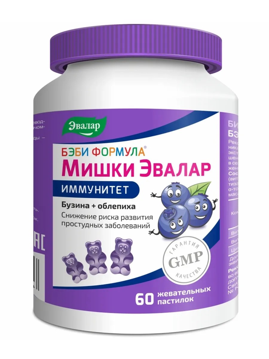 Бэби Формула Мишки Иммунитет от компании Эвалар - это биологически активная добавка (БАД) к пище – первые мармеладные пастилки с бузиной и облепихой для активации и поддержки детского иммунитета. Рекомендуется детям от 3-х лет до старшего подросткового возраста. Комплекс содержит экстракты бузины и облепихи, которые обладают иммуностимулирующим действием и в комплексе с витаминами С, Е и цинком способствует повышению защитных сил организма, снижению риска развития простудных заболеваний, поддержанию активности иммунной системы в сезон простуд, в период адаптации к детскому саду или школе, а также во время выздоровления. Приятный ягодный вкус мармеладных мишек Эвалар превратит прием витаминов в удовольствие.