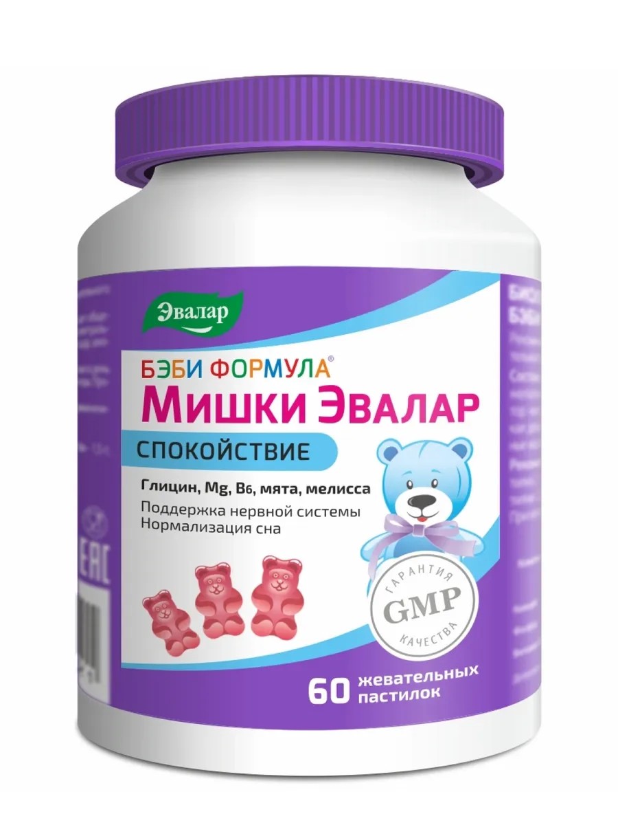 Бэби Формула Мишки Спокойствие от компании Эвалар - это биологически активная добавка (БАД) к пище – первые мармеладные мишки с глицином и магнием для спокойствия и сна ребятишек. Разработаны для детей от 3-х лет до старшего подросткового возраста. Грамотно подобранные компоненты комплекса – глицин, магний и витамин B6, усиленные натуральными экстрактами мелиссы и мяты – способствуют успокаивающему эффекту, поддержанию нервной системы ребенка при повышенных нагрузках, уменьшению возбудимости и тревоги, повышению концентрации внимания, усидчивости, нормализации сна. Эти вкусные мармеладные мишки со вкусом клубники являются незаменимым помощником для родителей, которые хотят уменьшить стрессовое воздействие на организм ребёнка, обеспечить своим детям спокойствие и уверенность в себе.