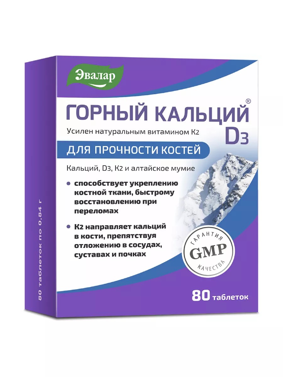 Для его усвоения Кальция организуму требуется немало дополнительных условий. Одно из них -присутствие витамина D3, а самое главное -наличие микроэлементов: марганца, меди, бора, фосфора, цинка, кремния и т. д. Горный кальции D3 с мумие полностью отвечает этим условиям. Горный кальций, Эвалар на 100% удовлетворяет суточную потребность организма, как в кальции, так и в витамине D3. Мумие в составе Горного кальция содержит более 30 макро- и микроэлементов, что способствует более полному усвоению кальция организмом. Мумие является естественным катализатором доставки кальция в костную ткань, способствует улучшению минерального состава и структуры костной ткани. Именно поэтому Горный кальций D3, сочетаясь в одной таблетке с мумиё, способствует лучшему усвоению кальция, поддержанию его обмена, регенерации костной ткани при переломах.Способ примененияВзрослым - по 2 таблетки 2 раза в день во время еды, запивая водой. Продолжительность приема - не менее 1 месяца.