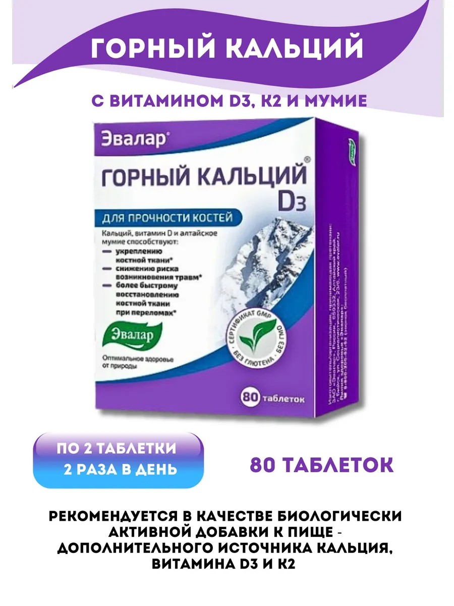 Эвалар Горный кальций с витамином D3, К2 и мумие,таблетки 80шт*1уп