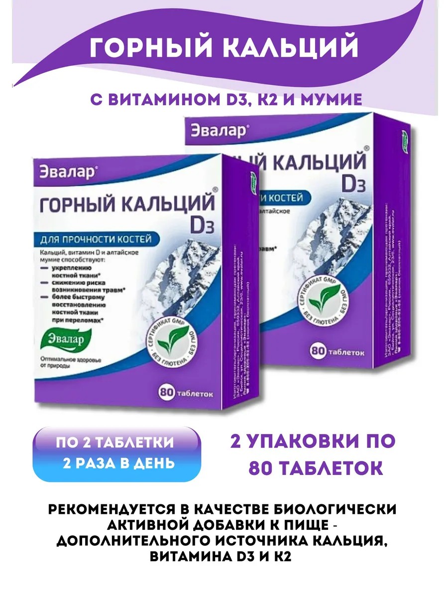 Эвалар Горный кальций с витамином D3, К2 и мумие,таблетки 80шт*2уп