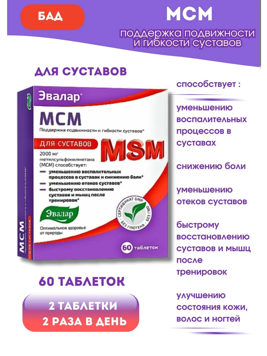 МСМ - Биологически активная добавка (БАД) к пище - для уменьшения воспалительных процессов в суставах, отеков, снижения боли, быстрого восстановления суставов и мышц, в том числе после тренировок