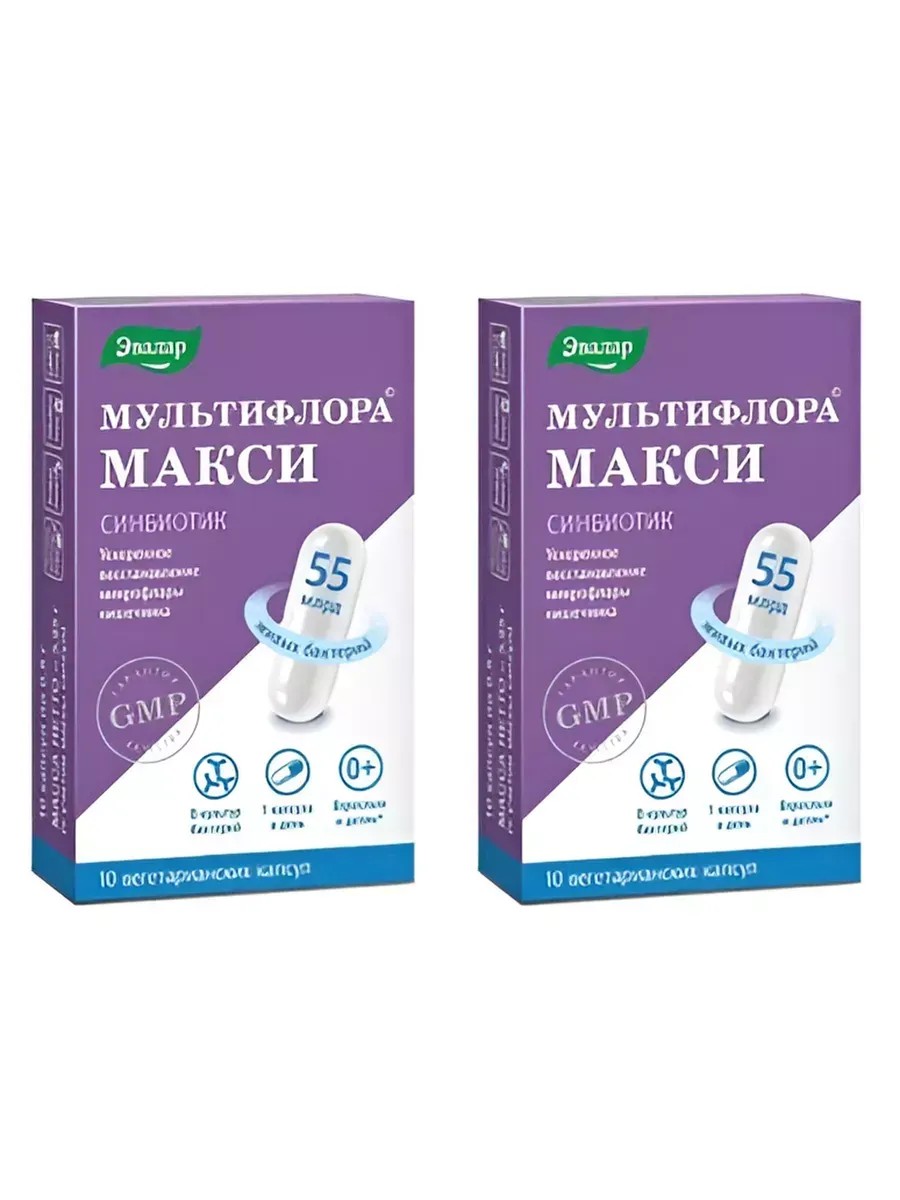 Мультифлора Макси - это синбиотик (пробиотик+пребиотик) нового поколения для ускоренного восстановления микрофлоры кишечника взрослых и детей со второй недели жизни.Содержит 55 миллиардов КОЕ живых культур.Мультифлора макси способствует:-формированию и росту нормальной микрофлоры кишечника, поддержанию здоровья кишечника, улучшению состояния при синдроме раздраженного кишечника, кишечных инфекциях;-улучшению пищеварения, нормализации работы желудочно-кишечного тракта;-укреплению иммунитета, повышению устойчивости организма к вирусным инфекциям.Бифидобактерии ускоряют переваривание белков, жиров, стимулируют перистальтику кишечника, участвуют в синтезе и всасывании витаминов группы «В», витамина К, фолиевой и нуклеиновых кислот, способствуют синтезу незаменимых аминокислот. Они стимулируют синтез иммуноглобулинов, что играет важную роль в формировании общего иммунитета человека1.Лактобактерии составляют значительную часть микрофлоры кишечника. Вступая во взаимодействие с другими микробами, лактобактерии продуцируют собственные антибиотики и подавляют гнилостные условно-патогенные микроорганизмы и возбудителей острых кишечных инфекций. Вырабатывают биологически активные вещества, регулирующие многие функции организма2.Пребиотик (фруктоолигосахариды) являются пищей для полезных бактерий. В нерасщепленном виде они достигают кишечника, после чего начинается микробная ферментация3.Преимущества Мультифлора Макси:- Синбиотик (содержит как пробиотики, так и пребиотики)- Высокая эффективность и высокий показатель количества жизнеспособных микроорганизмов: 55 млрд. КОЕ живых культур в 1 капсуле.- Синергия 8 штаммов (5 видов лактобактерий и 3 вида бифидобактерий) и 1 пребиотика (фруктоолигосахариды).- Высокая пробиотическая активность и стабильность достигается за счет трех технологических ступеней производства: технология ферментации высокой плотности, технология активного покрытия, технология лиофилизации (сублимационной сушки). Бактерии устойчивы к воздействию желудочного сока.- Удобный прием - 1 капсула в день.- Подходит детям со 2 недели рождения.- Не требует хранения в холодильнике.- Растительная капсула, подходит вегетарианцам.- Не содержит сахара, подходит диабетикам.- Не содержит диоксид титана, глютена, ГМО.- Производство в соответствии с международным стандартом GMP.