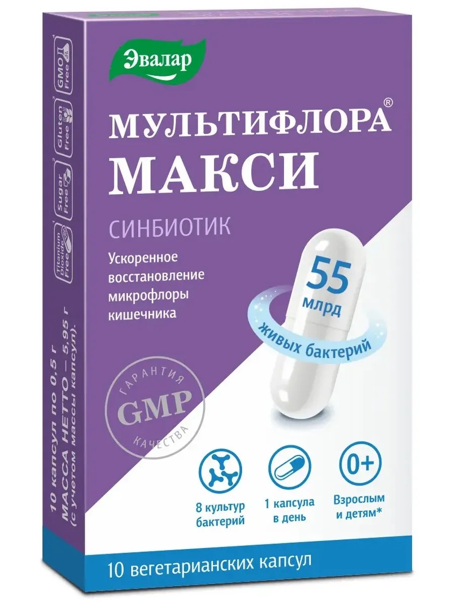Мультифлора Макси от «Эвалар» – самый мощный пробиотик усиленный пребиотиком (в 12 раз сильнее1 самого популярного пробиотика) для ускоренного восстановления микрофлоры кишечника и укрепления иммунитета при дисбактериозе. 8 видов живых пробиотических бактерий + пребиотик усиливают и дополняют действия друг друга. Мультифлора Макси помогает восстановить правильный баланс микрофлоры кишечника и нормализовать состояние при нарушении пищеварения, при дисбактериозе, запорах, приеме антибиотиков, кишечных инфекциях, аллергических состояниях у взрослых и детей со второй недели жизни. При терапии антибиотиками прием следует начинать одновременно с приемом антибиотиков. Мультифлора Макси способствует: •формированию и росту нормальной микрофлоры кишечника •поддержанию здоровья кишечника •улучшению состояния при синдроме раздраженного кишечника, кишечных инфекциях •улучшению пищеварения •нормализации работы желудочно-кишечного тракта •укреплению иммунитета, повышению устойчивости организма к вирусным инфекциям •ускоренное восстановление микрофлоры кишечника. Преимущества Мультифлора Макси: •Высокая эффективность и высокий показатель количества полезных культур: 55 млрд. КОЕ живых бактерий в 1 капсуле •Высокая пробиотическая активность и стабильность достигается за счет трех технологических ступеней производства: технология ферментации высокой плотности, технология активного покрытия, технология лиофилизации (сублимационной сушки). Бактерии устойчивы к воздействию желудочного сока. •В 12 раз сильнее обычного пробиотика •Эффект с 1 капсулы •Удобный прием – 1 капсула в день •1 капсула = множество преимуществ •Восстановление микрофлоры за 10 дней = 1 упаковка на курс приема •Подходит детям со 2 недели жизни •Растительная капсула, подходит вегетарианцам •Не требует хранения в холодильнике •Не содержит лактозы, сахара, диоксида титана, ГМО и глютена •Производство в соответствии с международным стандартом качества GMP.