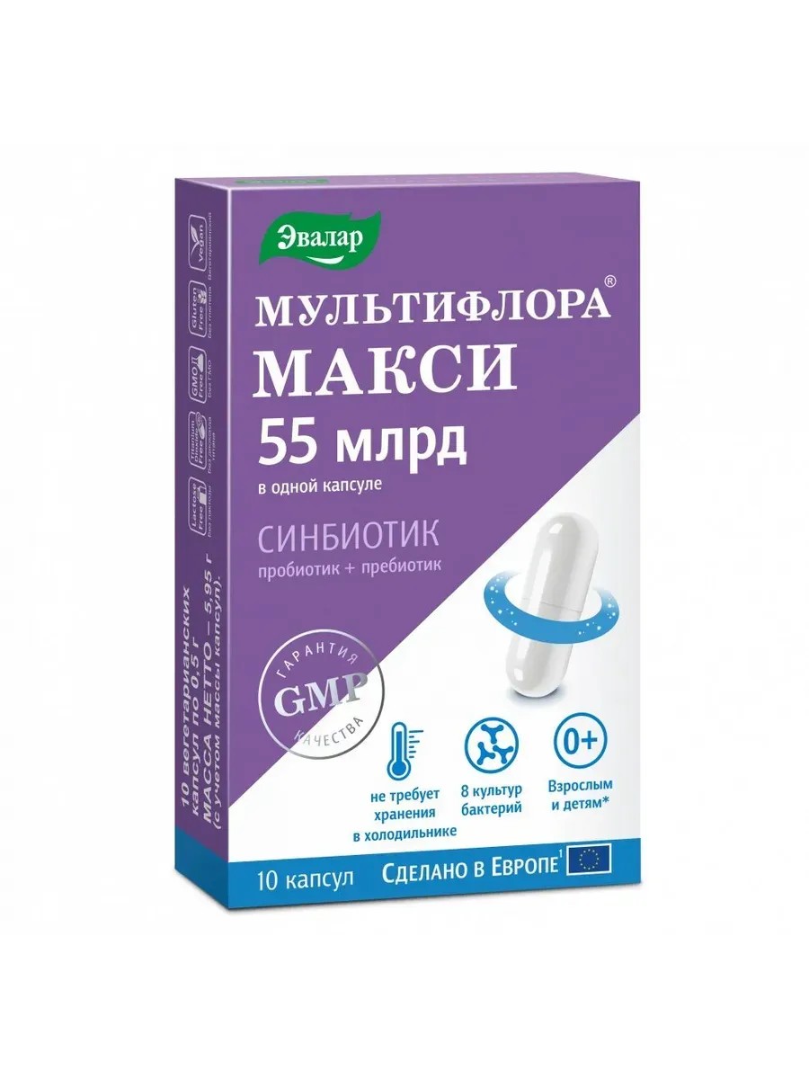 Multiflora Maxi from Evalar is the most powerful probiotic enhanced with a prebiotic (12 times stronger than the most popular probiotic) for accelerated restoration of intestinal microflora and strengthening of the immune system in case of dysbacteriosis. 8 types of live probiotic bacteria + prebiotic enhance and complement each other's actions. Multiflora Maxi helps to restore the correct balance of intestinal microflora and normalize the condition in case of indigestion, dysbacteriosis, constipation, taking antibiotics, intestinal infections, allergic conditions in adults and children from the second week of life. During antibiotic therapy, administration should be started simultaneously with taking antibiotics. Multiflora Maxi promotes: formation and growth of normal intestinal microflora; maintaining intestinal health; improving the condition in irritable bowel syndrome, intestinal infections; improving digestion; normalizing the gastrointestinal tract; strengthening the immune system, increasing the body's resistance to viral infections; accelerated restoration of intestinal microflora.