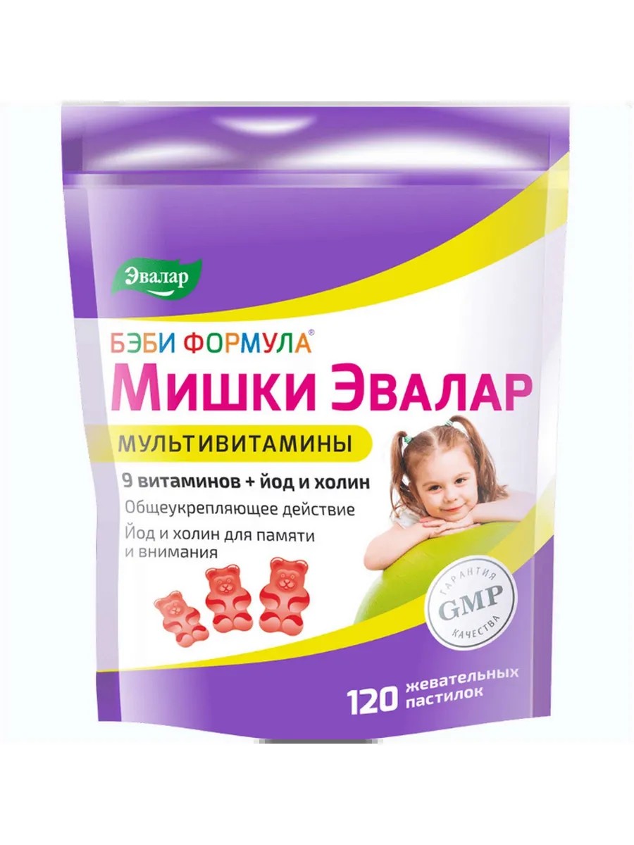 Мармеладные витаминные пастилки БЭБИ ФОРМУЛА Мишки Мультивитамины от компании Эвалар Девять витаминов в их составе усилены минералами цинком и йодом, а также холином для памяти, внимания и интеллекта.Благодаря такому составу, БЭБИ ФОРМУЛА Мишки Мультивитамины способствует:Обогащению организма витаминами и минераламиОбщеукрепляющему эффектуУлучшению памяти и внимания, интеллектуальному развитию ребенкаПоддержке организма ребенка в период адаптации в детском саду или школеПреимущества Бэби Формула Мишки Мультивитамины:Отличаются качественным составом: созданы на основе европейских ингредиентов высокого качества.Содержат в составе натуральный сок (яблочный).Полное отсутствие искусственных красителей, ароматизаторов и консервантов.Без глютена и ГМО.Усиленный состав: богатый набор витаминов усилен минералами.Приятный вкус: детям нравятся мармеладные витаминки с фруктовым вкусом.Высокое качество гарантировано международным стандартом GMP