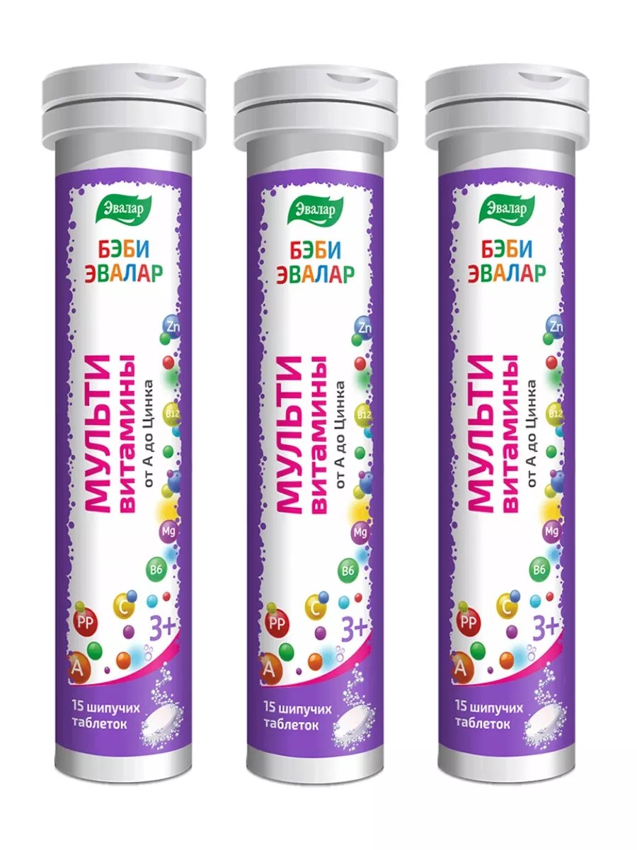Бэби Эвалар мультивитамины от А до ZN 15 шт. таблетки шипучие массой 5,2 г – это биологически активная добавка к пище, вкусный и полезный шипучий напиток с ярким клубничным вкусом и мощным витаминно-минеральным составом. Бэби Эвалар мультивитамины от А до ZN способствует поддержанию организма ребенка в период адаптации к школе, детскому саду , восстановлению после перенесенных заболеваний, предупреждению дефицита витаминов, макро- и микроэлементов у детей, нормальному росту и развитию детского организма. Шипучая форма безопасна для желудка, так как имеет нейтральный рН, быстро растворяется в воде. Не содержит подсластителей (сахарозаменителей), искусственных красителей, ароматизаторов и консервантов, глютена, ГМО. Рекомендуется детям с 3-х лет принимать по 1 таблетке 1 раз в день. Перед применением рекомендуется проконсультироваться с врачом-педиатром.