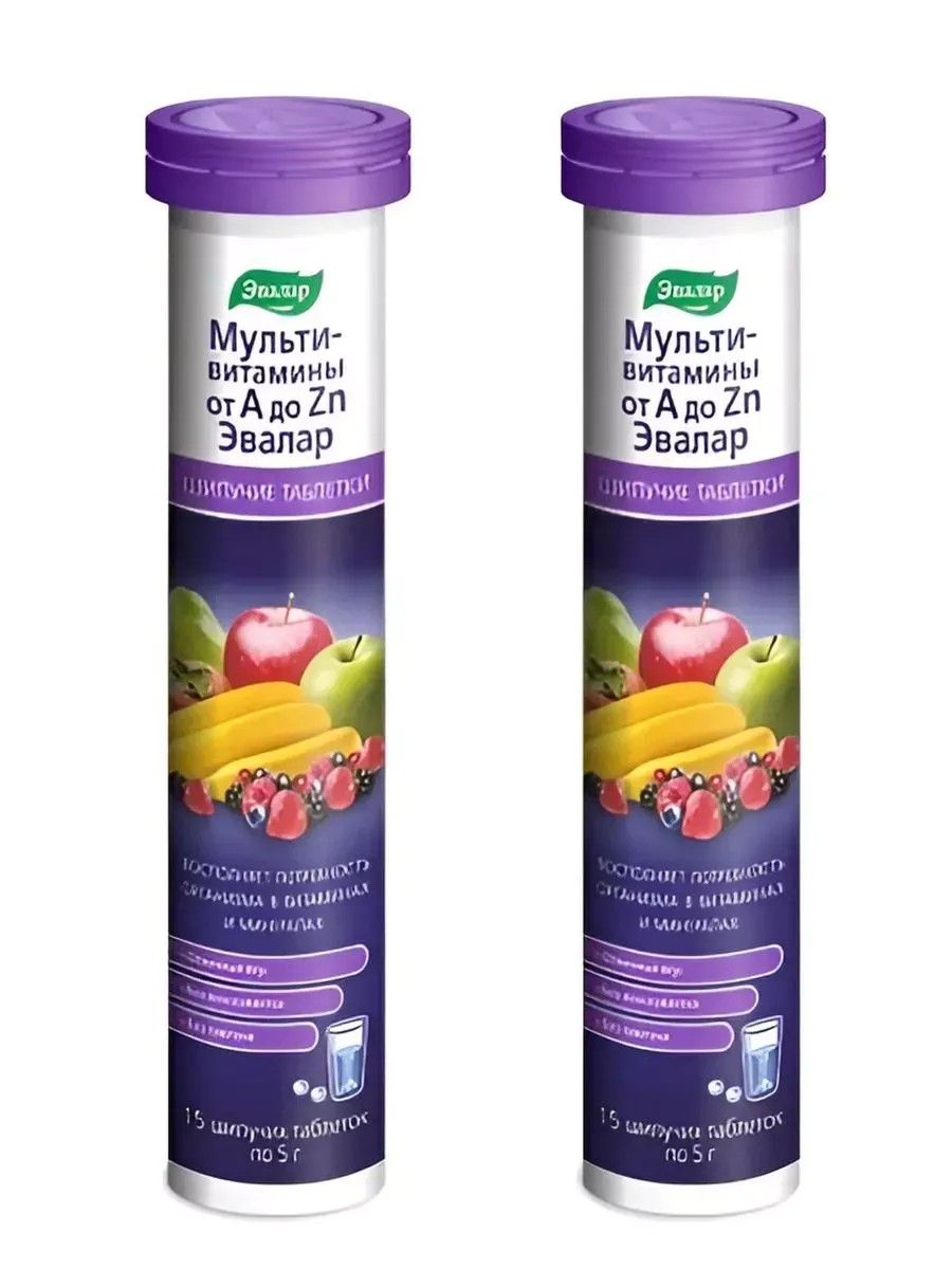 ЭВАЛАР МУЛЬТИВИТАМИНЫ ОТ A ДО ZN - Биологически активная добавка (БАД) к пище для восполнения дефицита витаминов и минералов, ежедневной поддержки здоровья, энергии, хорошего самочувствия, укрепления иммунитета.Есть множество факторов, которые могут привести к дисбалансу витаминов и минералов в организме: стресс, переутомление, перенесенное заболевание, несбалансированное питание. И даже если все хорошо, но вы регулярно тренируетесь в фитнес-клубе, соблюдаете диету или переносите значительные интеллектуальные нагрузки, организм испытывает повышенную потребность в витаминах и минералах.Как известно, организм человека не синтезирует витамины или вырабатывает их в недостаточном количестве. Однако он регулярно должен получать эти вещества с пищей, чтобы поддерживать метаболизм в норме. Дефицит витаминов неизбежно приводит к нарушению зависящих от них процессов и физиологических функций. Кроме того, для реализации нормальной активности витаминов большое значение имеет их правильный баланс с минералами.Минеральные вещества также относятся к жизненно необходимым компонентам питания и участвуют в самых разных биохимических процессах обмена.Мультивитамины от А до Zn Эвалар - это сбалансированная формула из 19 важнейших нутриентов для ежедневной поддержки здоровья, энергии, хорошего самочувствия и укрепления иммунитета. Содержит витамины А, С, Е, К, D3, витамины группы В, кальций, магний, цинк, железо, йод.Комплекс оказывает общеукрепляющее действие и необходим организму для поддержания и улучшения его функциональной активности. Способствует предупреждению дефицита витаминов и минеральных веществ, повышению умственной и физической работоспособности, может применяться при состояниях, сопровождающихся повышенной потребностью в витаминах, макро- и микроэлементах.Шипучие таблетки Мультивитамины от А до Zn Эвалар:• моментально растворяются в воде;• легко усваиваются организмом, не вызывая раздражения желудка;• без консервантов, без глютена;• сочный цитрусовый напиток с приятным вкусом;• удобный прием для тех, кто испытывает проблемы с глотанием.