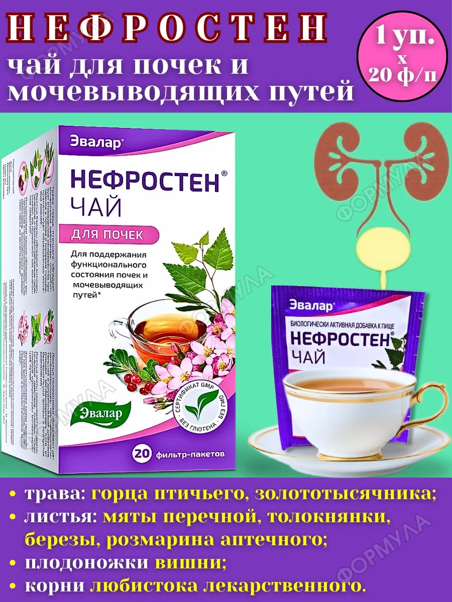 Этот почечный фиточай полностью натуральный, без искусственных добавок и консервантов, с приятным мягким вкусом и удобной упаковкой – всего 20 фильтр-пакетов для простого заваривания. Попробуйте курс и позаботьтесь о здоровье почек уже сегодня! Чай Нефростен – лучшая поддержка мочевыводящей системы при цистите, пиелонефрите, отеках и профилактике мочекаменной болезни.
