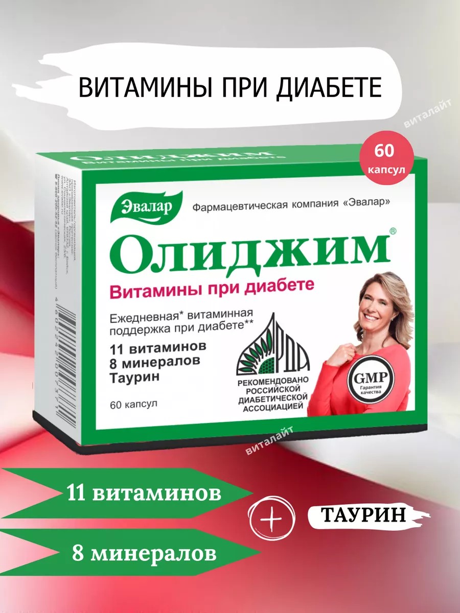 Витамины при диабете «Олиджим» — это комплексная пищевая добавка, в состав которой входят 8 минералов, 11 витаминов и таурин, способный снижать уровень глюкозы в крови.