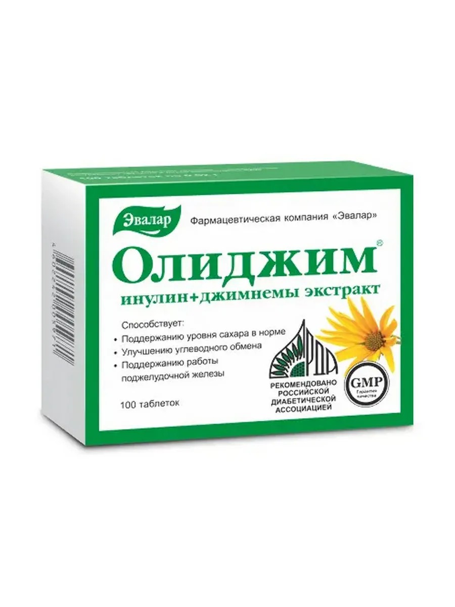 Натуральный препарат Олиджим особенно рекомендован для регулярного применения людям со склонностью к повышенному уровню сахара и полноте. Натуральный комплекс экстракта джимнемы и инулина обладает сахаропонижающим (гипогликемическим) действием и способствует: поддержанию в норме уровня сахара в крови, улучшению жирового и углеводного обмена в организме; поддержанию работы поджелудочной железы, выработке инсулина и повышению чувствительности клеток к нему; уменьшению всасывания сахаров в желудочно-кишечном тракте; снижению аппетита, уменьшению тяги к сладкому, поддержанию веса в норме; предотвращению возникновения осложнений при диабете. взрослым по 2 таблетки 2 раза в день во время еды. Продолжительность приема не менее 1 месяца. Рекомендуется регулярный прием с 5-дневным перерывом. РЕКОМЕНДАЦИИ ПО ПРИМЕНЕНИЮ: взрослым по 2 таблетки 2 раза в день во время еды. Продолжительность приема не менее 1 месяца. Рекомендуется регулярный прием с 5-дневным перерывом.