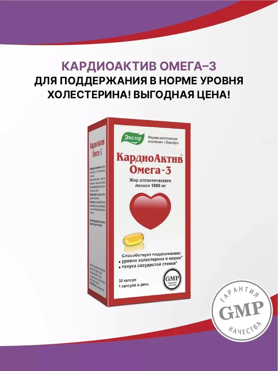 КардиоАктив Омега 3 от Эвалар — высокоочищенный рыбий жир в капсулах с высокой концентрацией омега-3 (≥35%). Omega способствует поддержке сердечно-сосудистой системы и нормализации липидного обмена. Всего 1 капсула в день для восполнения потребности в ПНЖК. Подходит женщинам и мужчинам.