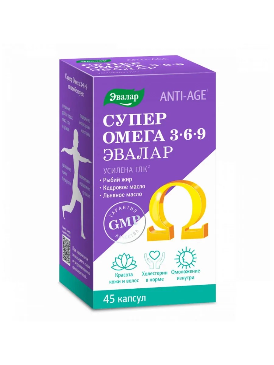 Омега 3-6-9 - сбалансированный комплекс трех жирных кислот - Омега-3, Омега-6 и Омега-9 - который способствует: - улучшению работы сердца, мозга, глаз и суставов; - поддержанию в норме уровня холестерина; - красоте кожи и волос; - омоложению и оздоровлению организма. Каждая капсула комплекса "Омега 3-6-9" ANTI-AGE Эвалар содержит следующие действующие компоненты: - Кедровое масло (Омега-6, Омега-9); - Льняное масло (Омега-3, Омега-6, Омега-9); - Рыбий жир (Омега-3). Такое сочетание ингредиентов позволяет обеспечить сбалансированное поступление в организм важнейших полиненасыщенных жирных кислот.