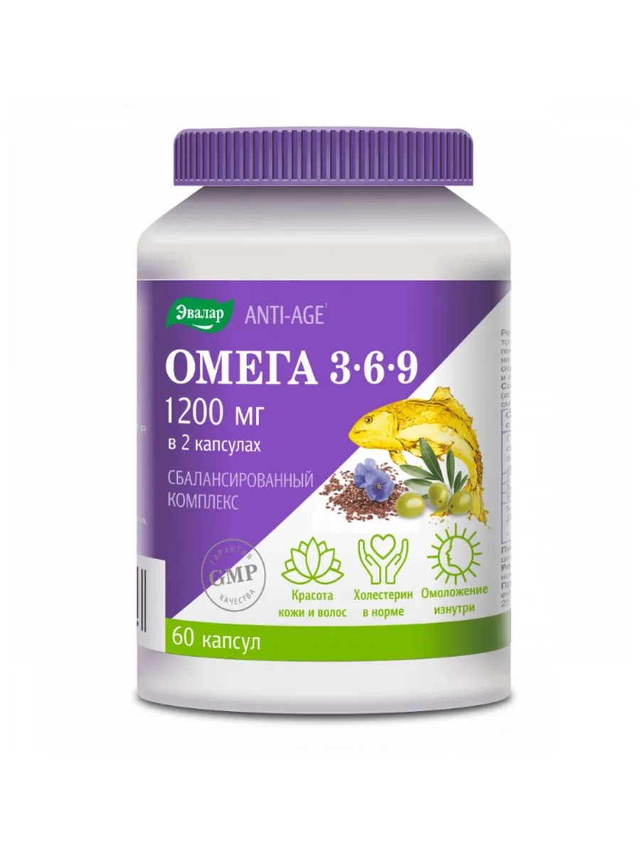 Balanced complex: - fish oil; - flaxseed oil; - olive oil; - vitamin E. Omega 3-6-9 Anti-Age helps: - improve the function of the heart, brain, eyes, and joints; - maintain normal cholesterol; - beautiful skin and hair; - rejuvenate and heal the body.