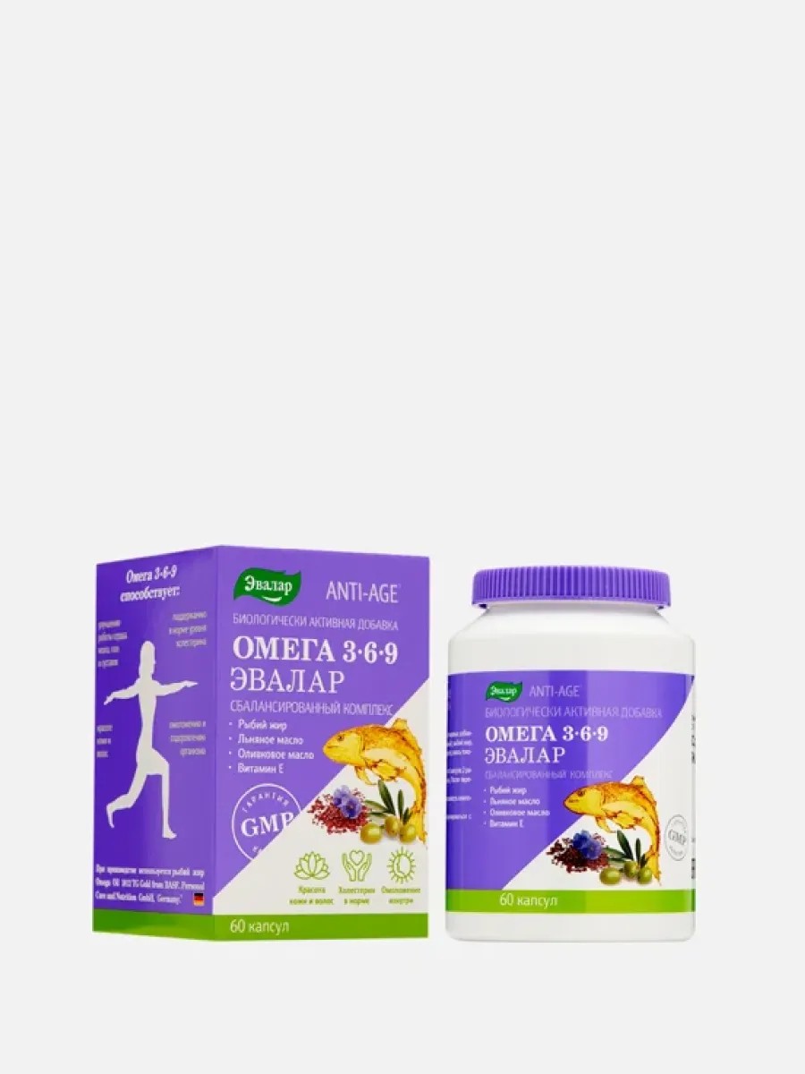 ЭВАЛАР Омега 3-6-9 ANTI-AGE; это сразу три жирные кислоты: омега-3, омега-6 и омега-9. Биодобавка поможет сердцу, мозгу, глазам и суставам ощутить себя не только здоровее, но и моложе. Если в меню недостаточно продуктов, богатых кислотами, комплекс от Эвалар; самое простое и доступное решение. При недостаточно сбалансированном рационе питания он поможет получить необходимые организму вещества. А крепкий иммунитет будет еще одним приятным бонусом.