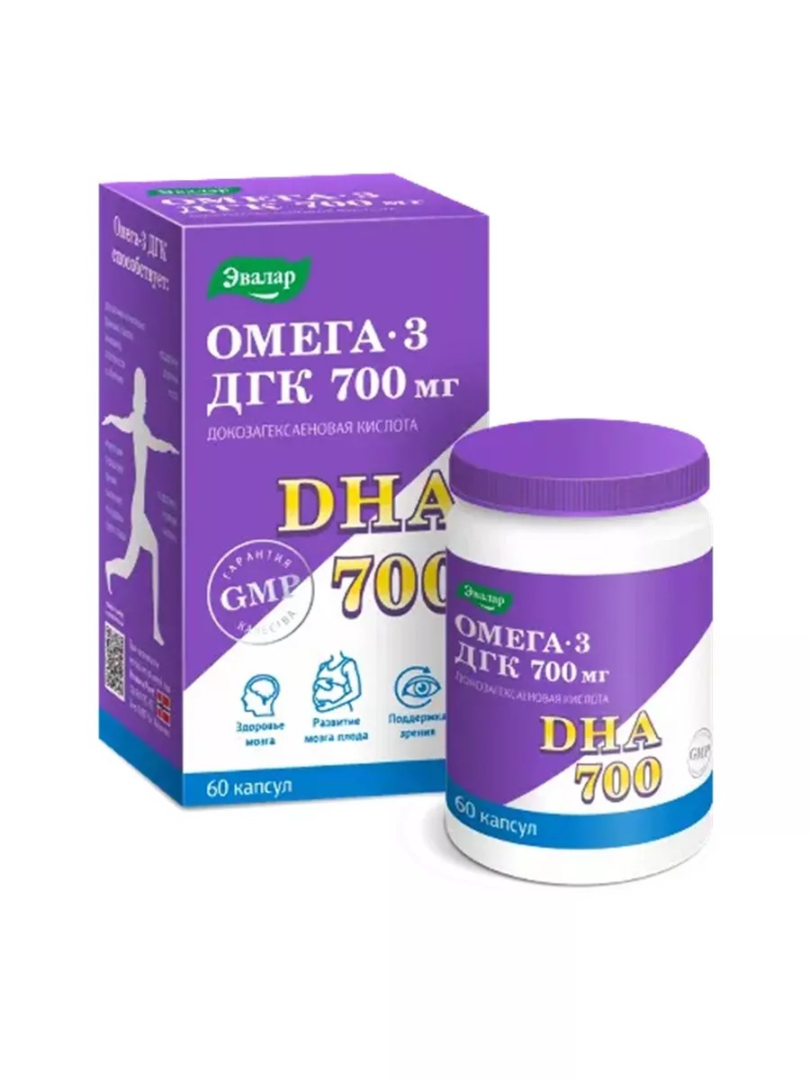Докозагексаеновая кислота (ДГК/DHA) – одна из разновидностей полиненасыщенных жирных кислот класса омега-3, которая является незаменимой. ДГК – наиболее распространенная омега-3 жирная кислота в головном мозге и сетчатке глаз.Известно, что при высоких интеллектуальных нагрузках, а также при возрастных изменениях организма ухудшаются внимание, память и другие когнитивные (умственные) функции. При этом высокое содержание ДГК в организме позволяет сохранить их на нормальном уровне.Омега-3 ДГК 700 от компании Эвалар содержит высокоочищенную омега-3 (ДГК) в высокой дозировке и способствует:•поддержке здоровья мозга, улучшению когнитивных функций, памяти, внимания, способности к обучению;•поддержке нервной системы;•коррекции нарушения зрения, снижению «синдрома сухого глаза».•во время беременности способствует правильному развитию мозга, органов зрения и нервной системы плода.