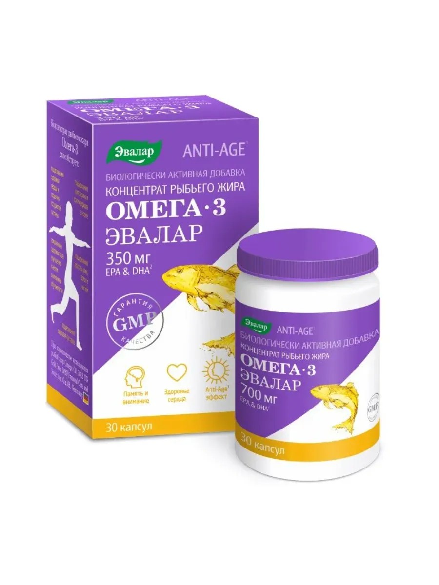 Концентрат рыбьего жира Омега-3 - биологически активная добавка (БАД) к пище, которая содержит самую популярную дозировку омега-3 – 350 мг в 1 капсуле. Для производства капсул используется сырье высочайшего качества от ведущих мировых производителей с исключительно высокой степенью очистки. Омега-3 получают из диких рыб холодных морей. Качество препарата гарантировано международным стандартом GMP. Регулярный прием капсул Концентрат рыбьего жира Омега-3 Эвалар оказывает поддерживающий эффект для работы сердечно-сосудистой системы, зрения, суставов, иммунитета, нервной системы и мозга. Препарат разрешен беременным и кормящим женщинам.
