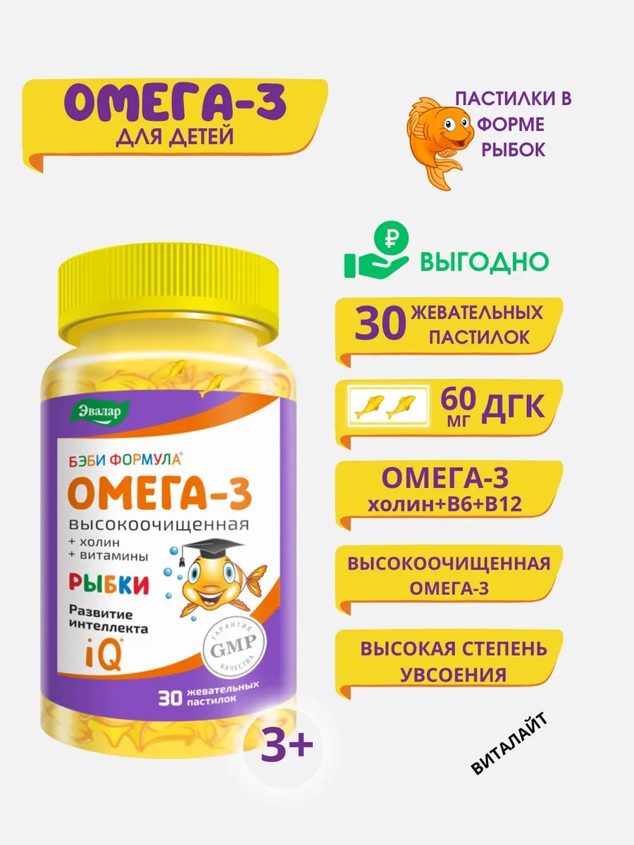 Бэби Формула Рыбки Омега-3 от компании Эвалар – это биологически активная добавка к пище - вкусная мармеладная омега-з для развития детского интеллекта, памяти и внимания. Рекомендована детям с 3-х лет до старшего подросткового возраста. В составе комплекса – высокоочищенная омега-3 (докозагексаеновая кислота (ДГК)) из экологически чистых микроводорослей. Микроводоросли лишены аллергенных свойств, присущих рыбе. Помимо омега-3 комплекс усилен витаминами для мозга – В6, В12, С, а также холином. Рыбки Эвалар способствуют восполнению дефицита омега-3 (ДГК), улучшению работы мозга, развитию интеллекта, памяти и внимания, повышению способности к обучению, поддержанию нервной системы, формированию и поддержке хорошего зрения. А приятный фруктовый вкус сделают эти мармеладные рыбки приятным лакомством для вашего ребенка.
