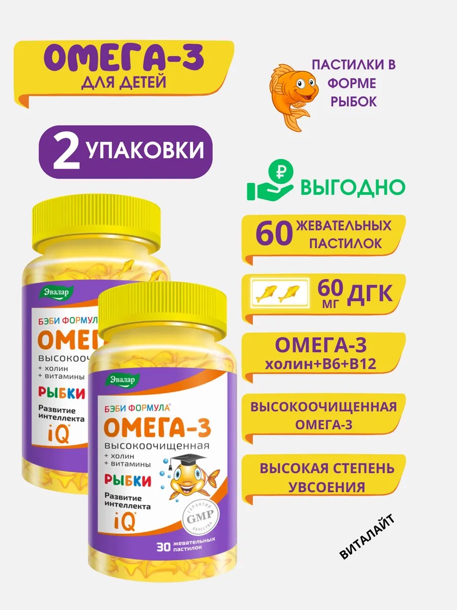 Baby Formula Fish Omega-3 from Evalar is a dietary supplement – a delicious gummy omega-3 for the development of children's intelligence, memory, and attention. Recommended for children aged 3 to late adolescence. The complex contains highly purified omega-3 (docosahexaenoic acid (DHA)) from environmentally friendly microalgae.