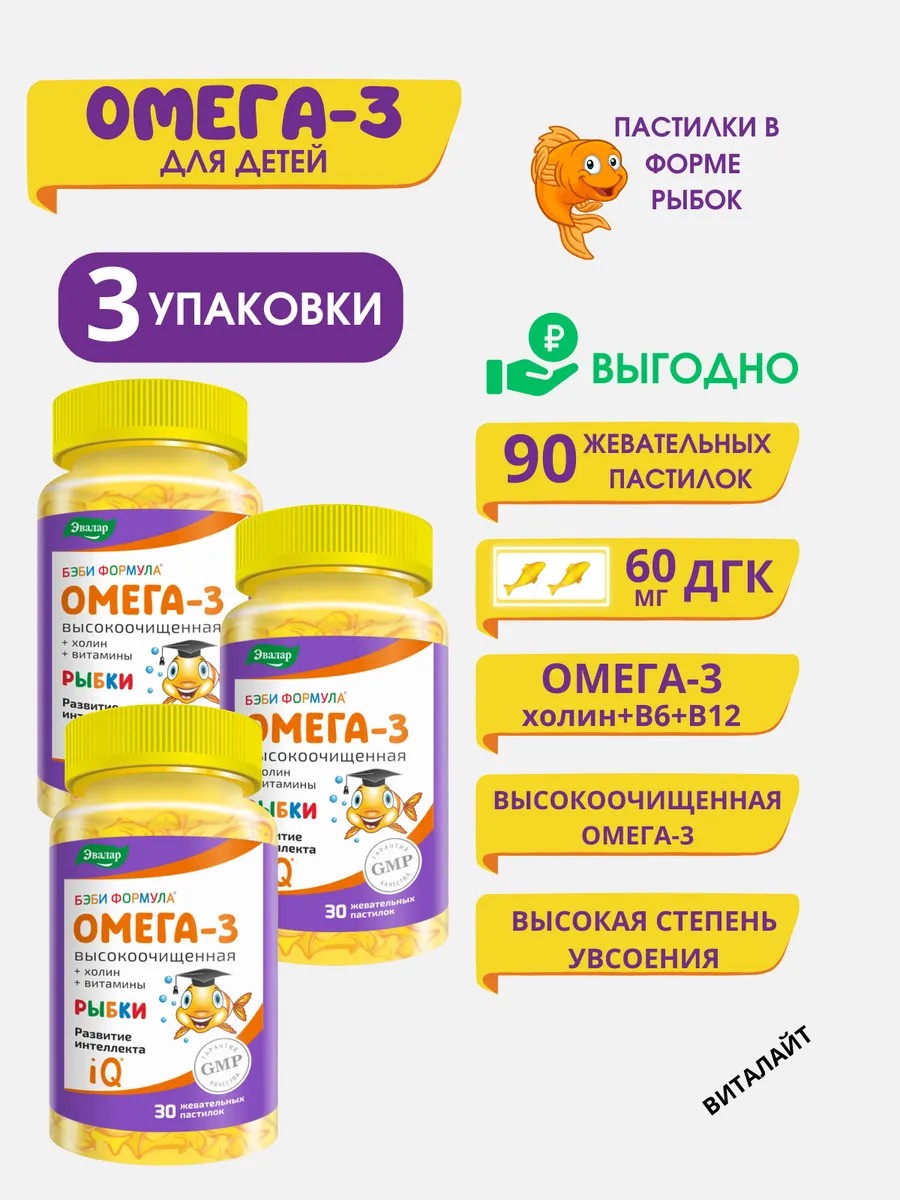 Бэби Формула Рыбки Омега-3 от компании Эвалар – это биологически активная добавка к пище - вкусная мармеладная омега-з для развития детского интеллекта, памяти и внимания. Рекомендована детям с 3-х лет до старшего подросткового возраста. В составе комплекса – высокоочищенная омега-3 (докозагексаеновая кислота (ДГК)) из экологически чистых микроводорослей. Микроводоросли лишены аллергенных свойств, присущих рыбе. Помимо омега-3 комплекс усилен витаминами для мозга – В6, В12, С, а также холином. Рыбки Эвалар способствуют восполнению дефицита омега-3 (ДГК), улучшению работы мозга, развитию интеллекта, памяти и внимания, повышению способности к обучению, поддержанию нервной системы, формированию и поддержке хорошего зрения. А приятный фруктовый вкус сделают эти мармеладные рыбки приятным лакомством для вашего ребенка.