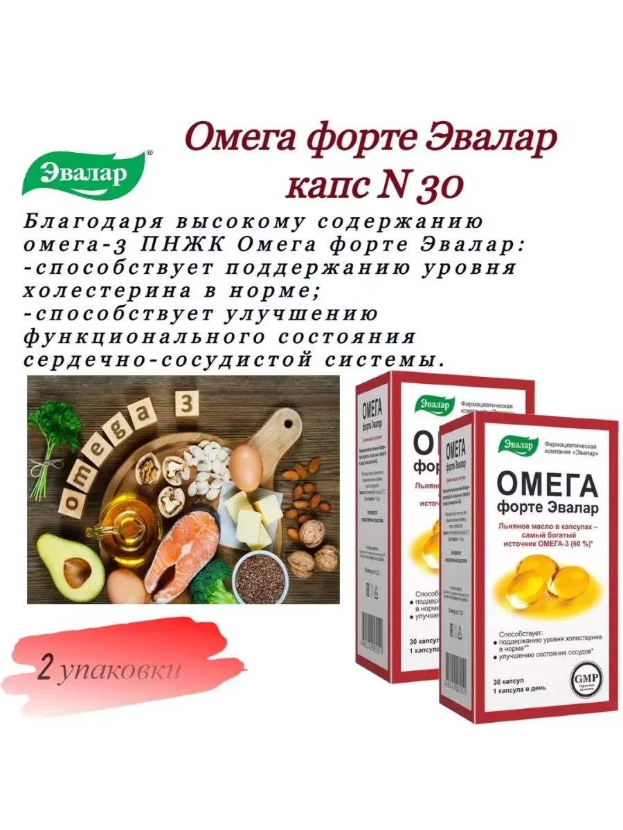 Омега-3 полиненасыщенные жирные кислоты являются структурными компонентами клеток сердца, крови, мозга, кровеносных сосудов.Они регулируют такие важные свойства клеточных мембран, как проницаемость, микровязкость, возбудимость.Именно от этих свойств клеточных мембран зависят различные процессы жизнедеятельности организма: передача сигналов между нервными клетками, активность работы мозга, состояние сетчатки глаза и многие другие.Омега-3 полиненасыщенные жирные кислоты являются строительным материалом для образования в организме важнейшего класса биологически активных веществ — эйкозаноидов.Эйкозаноиды обладают широким спектром биологического действия: поддерживают реологические свойства крови, тонус кровеносных сосудов и бронхов, сохраняют в норме кровяное давление, повышают иммунный статус, поддерживают состав и состояние слизистых оболочек.Рекомендации по применениюВзрослым по 1 капсуле 1 раз в день во время еды.Продолжительность приема — не менее 1 месяца.Рекомендуется регулярный прием.Благодаря высокому содержанию омега-3 ПНЖК Омега форте Эвалар:способствует поддержанию уровня холестерина в нормеспособствует улучшению функционального состояния сердечно-сосудистой системы.