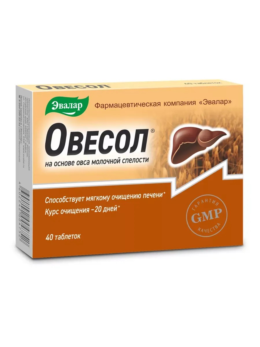 Овесол 40 шт. - это биологически активная добавка к пище, которые способствуют улучшению работы печени, желчного пузыря и кишечника. Препарат содержит экстракты лекарственных растений, таких как экстракт овса; экстракт бессмертника; экстракт мяты. Овесол помогает восстановить защитные функции печени, улучшает желчеотделение, уменьшает воспаление и нормализует работу кишечника. Овесол 40 шт. можно использовать для профилактики заболеваний печени и желчного пузыря.Овесол создан для бережного очищения печени и желчевыводящих путей. Способствует снижению риска образования камней.В составе «Овесол» богатые витаминами и другими биологически активными веществами плоды и травы:овес посевной, done куркума, бессмертник, мята перечная.Особенно богат полезными веществами овес посевной. Для приготовления раствора используется скошенный в фазу молочной спелости и высушенный овес, который выращивается на собственных плантациях Эвалар.Овес посевной. Используется высушенная трава, скошенная в фазу молочной спелости. Препараты на основе овса молочной спелости способствуют поддержанию в норме процессов пищеварения, функций печени, помогают защитить организм от токсинов.Куркума - корень куркумы и препараты на его основе помогают поддерживать в норме состояние печени и желчевыводящих путей.Бессмертник - способствует поддержанию в норме состава желчи и процесса желчеотделения, тонуса желчного пузыря, желчевыводящих путей и кишечника, метаболической функции печени.Мята перечная - действует спазмолитически желчегонно, улучшает пищеварение оказывает противовоспалительное действие. Принимают её при заболеваниях печени, при спазмах в желудке, кишечнике, при метеоризме, для улучшения аппетита.РЕКОМЕНДАЦИИ ПО ПРИМЕНЕНИЮ:Взрослым и детям старше 14 лет по 1 таблетке 2 раза в день во время еды. Продолжительность приема - 20 дней. Рекомендуется повторять прием 3-4 раза в год. Содержание в 2 таблетках (суточном приме)Экстракт овса 150 мгЭкстракт бессмертника 60 мгЭкстракт мяты 30 мгЭкстракт куркумы, 13,25 мгв том числе куркуминодиы, не менее 10 мг