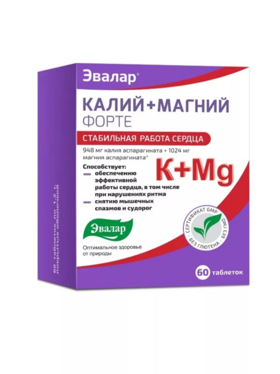 Действие: способствует обеспечению эффективной работы сердца, в том числе при нарушениях ритма, поддержанию здоровья сердечно-сосудистой системы, устранению дефицита калия и магния, снятию мышечных спазмов и судорог. стабильная работа сердца