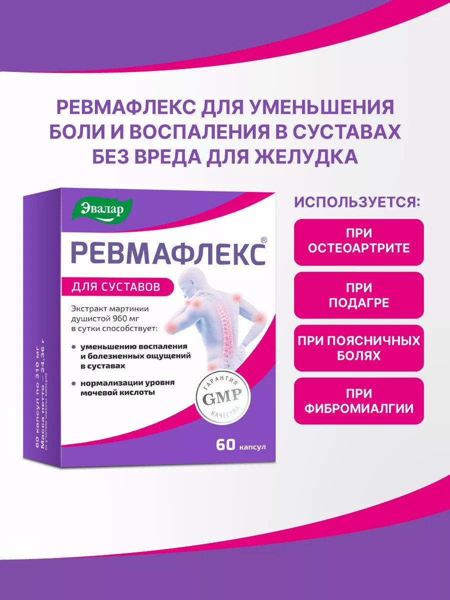 Ревмафлекс – натуральный препарат с высоким содержанием экстракта мартинии душистой для здоровья суставов. В отличие от нестероидных противовоспалительных средств (НПВС), Ревмафлекс не наносит вреда желудку. Его уникальная формула способствует улучшению подвижности и гибкости суставов и позвоночника, а также снижает воспаление и болезненные ощущения в суставах и позвоночнике. Кроме того, БАД Ревмафлекс помогает снизить риск разрушения хрящевой ткани и нормализовать уровень мочевой кислоты. Применение экстракта мартинии душистой для суставов имеет научное обоснование и подтверждается результатами многочисленных экспериментальных и клинических исследований. Ее противовоспалительное и обезболивающее действие помогает при ревматизме, миалгии, люмбаго и особенно эффективно при артритах. Более того, мартиния душистая способствует снижению уровня мочевой кислоты в сыворотке крови, предотвращая ее отложение в суставах и уменьшая риск возникновения подагры. Помимо этого, Ревмафлекс имеет хондропротекторное действие благодаря экстракту мартинии. Он помогает замедлить деструкцию хрящевой ткани, что является не менее важным при заболеваниях суставов. Способ применения: Взрослым - по 2 капсулы 2 раза в день во время еды. Продолжительность приема - не менее 1 месяца. При необходимости прием можно повторять. Перед применением рекомендуется проконсультироваться с врачом.