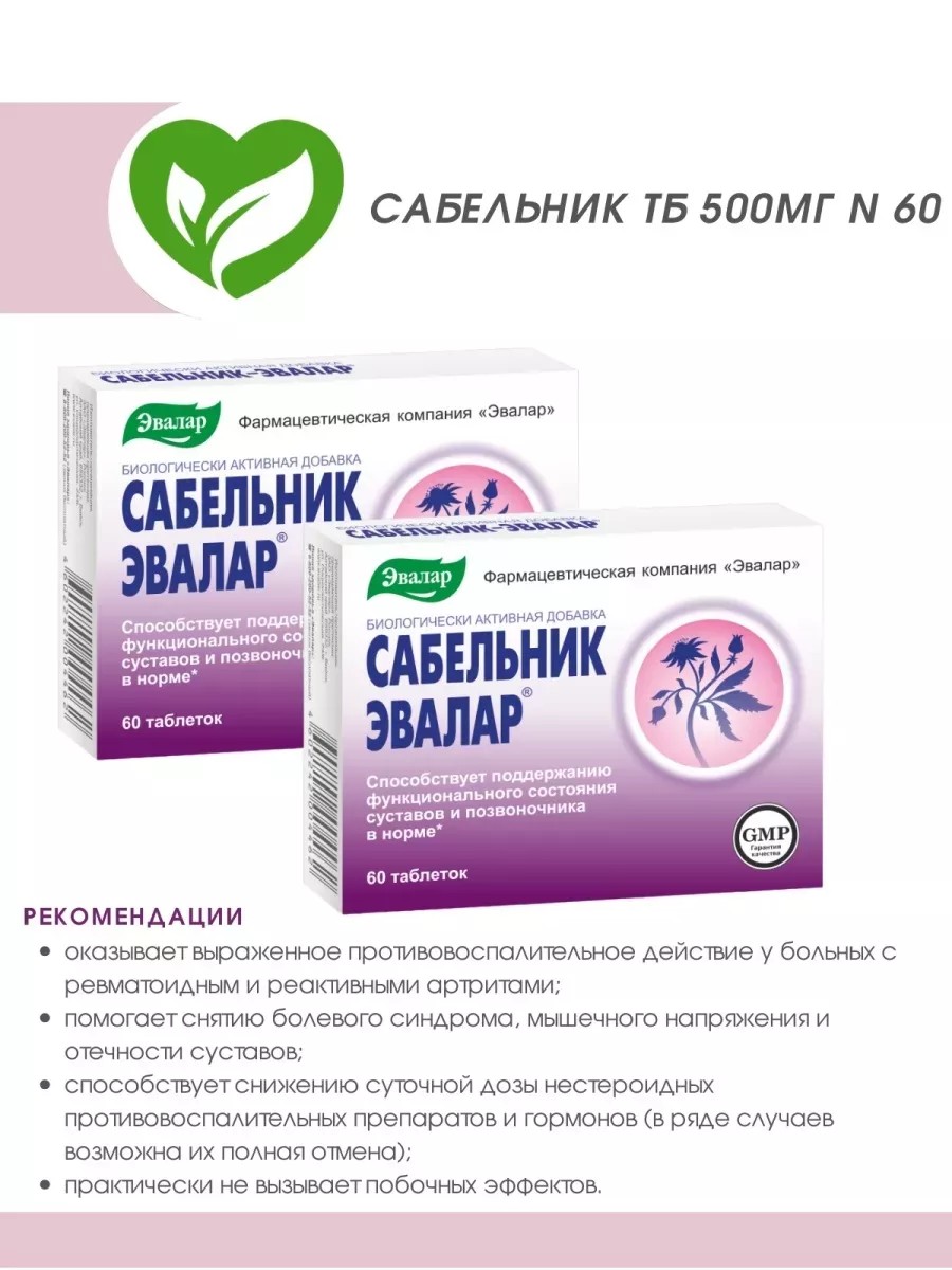 Сабельник-Эвалар комплекс натуральных средств на основе сабельника болотного, созданный для оказания помощи суставам.Сабельник болотный удивительное растение, которое природа наделила необычайной целебной силой. Его сила в комплексе биологически активных веществ, в частности дубильных, которые определяют противовоспалительные, болеутоляющие, регенерирующие и антибактериальные свойства сабельника.Препарат Сабельник-Эвалар рекомендован в качестве общеукрепляющего средства при повышенных нагрузках на опорно-двигательный аппарат. Применяется в комплексном лечении костно-суставных заболеваний (артриты, артрозы, подагра, остеохондроз и др.), эффективен и при ревматоидном полиартрите. Сочетается с другими, назначенными врачом, средствами и физиотерапевтическими методами лечения.