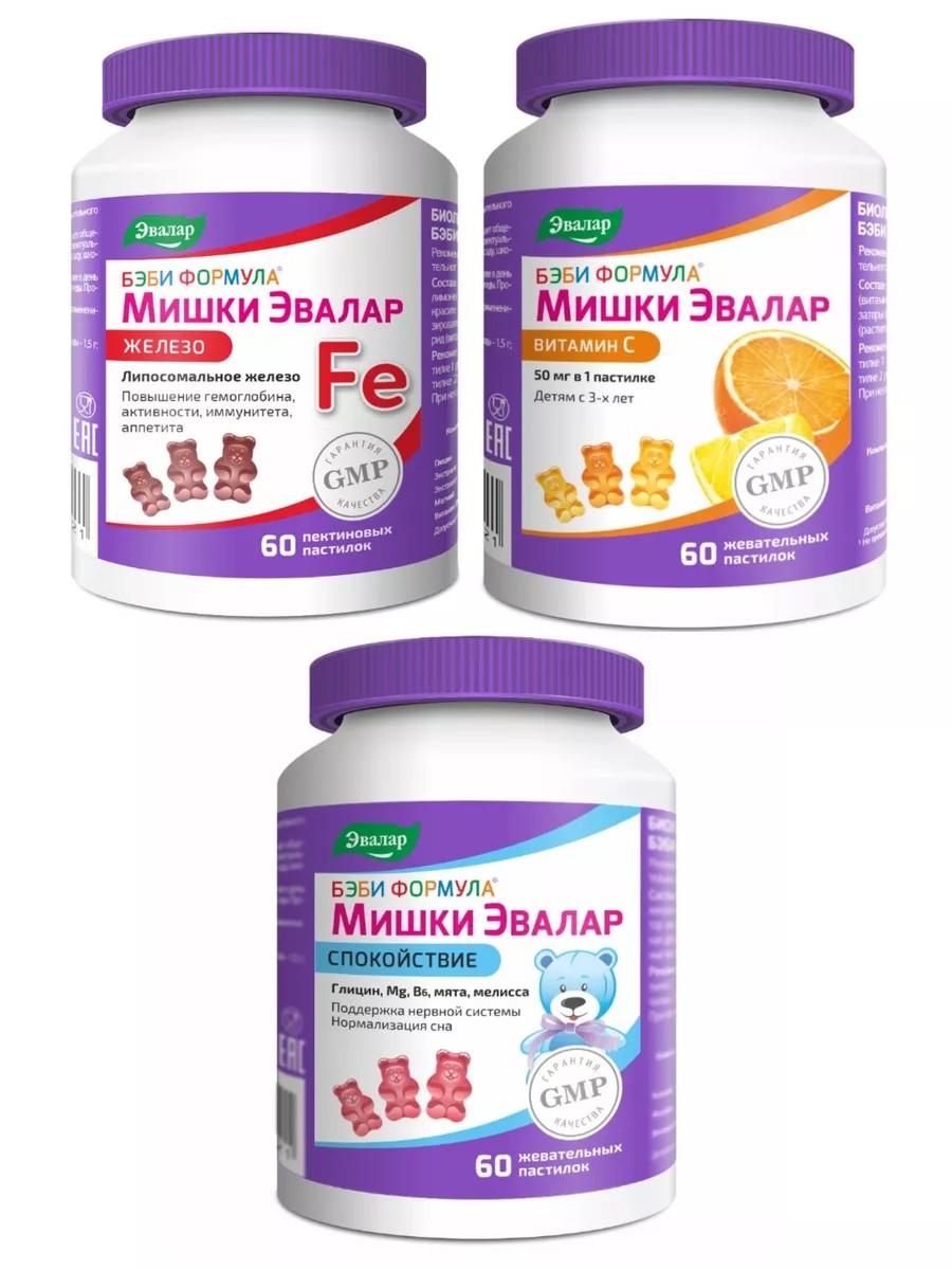 Эвалар Набор 3в1 бэби формула железо+витамин С+спокойствие N60