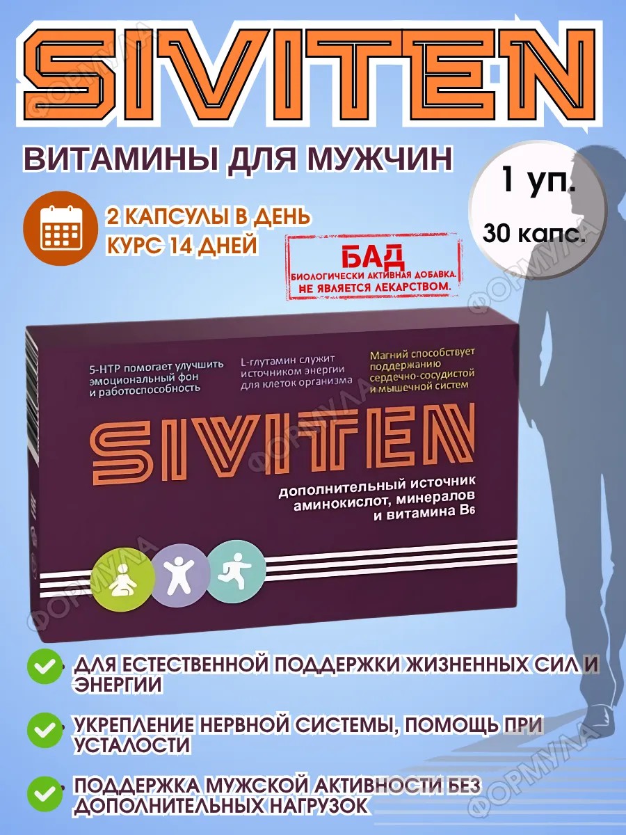 High bioavailability of the components ensures effective support of vital processes without undue strain on the body. Siviten is the choice of those seeking reliable and balanced support for men's health. It is recommended to take 2 capsules daily with meals for 14 days. Before use, be sure to consult a doctor, especially if you have chronic diseases. It is not a medicinal product.