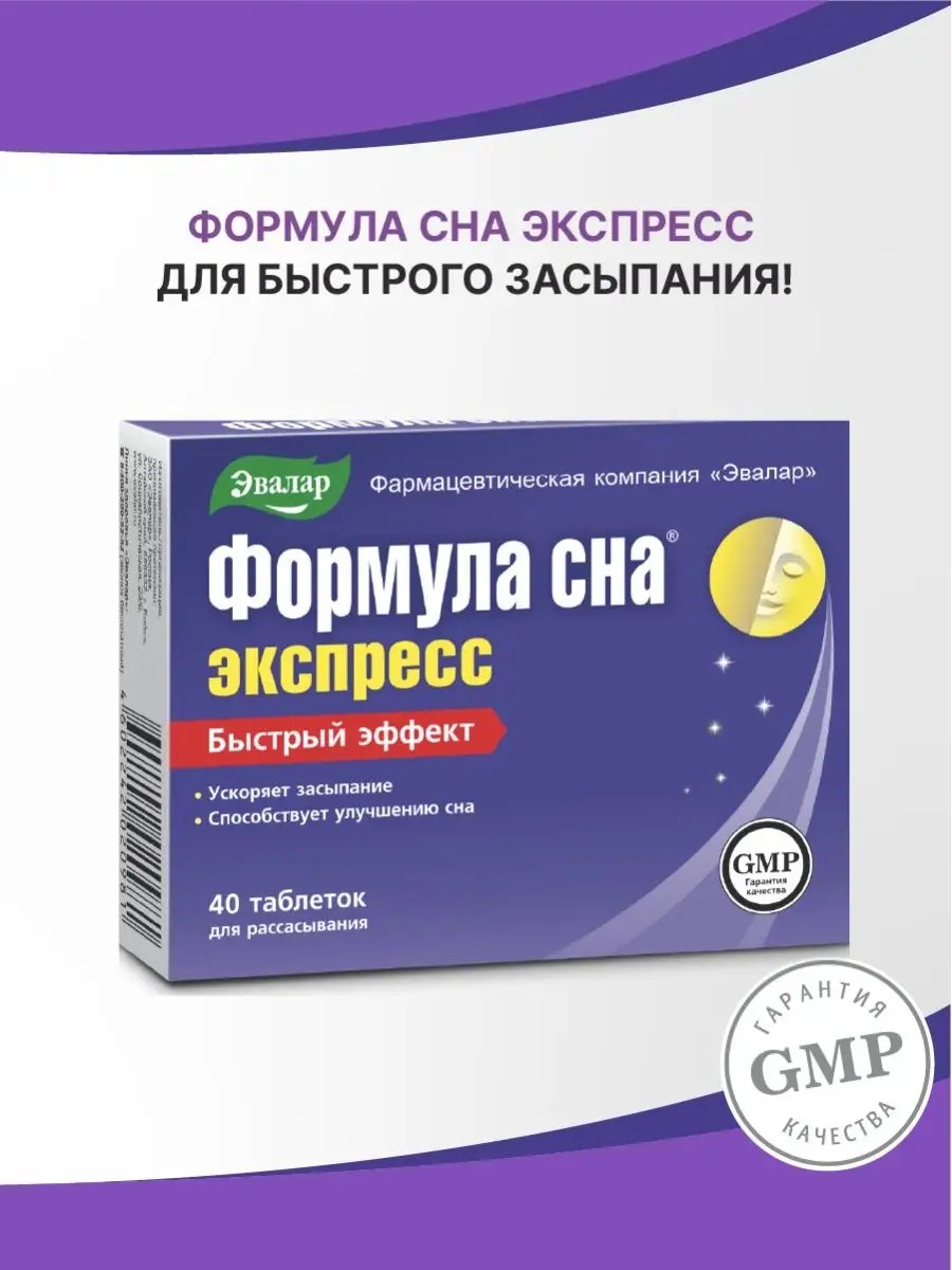 Таблетки для рассасывания Формула сна экспресс:- ускоряют засыпание;- оказывают положительно влияние на продолжительность и глубину сна;- удобны в применении - не требуют запивания, а также обеспечивают более быстрое наступление эффекта по сравнению с таблетками для приема внутрь. Способ применения: Взрослым рассасывать по 2 таблетки за 30 минут до сна. Допускается дополнительно рассасывать по 2 таблетки ночью в случае пробуждения.