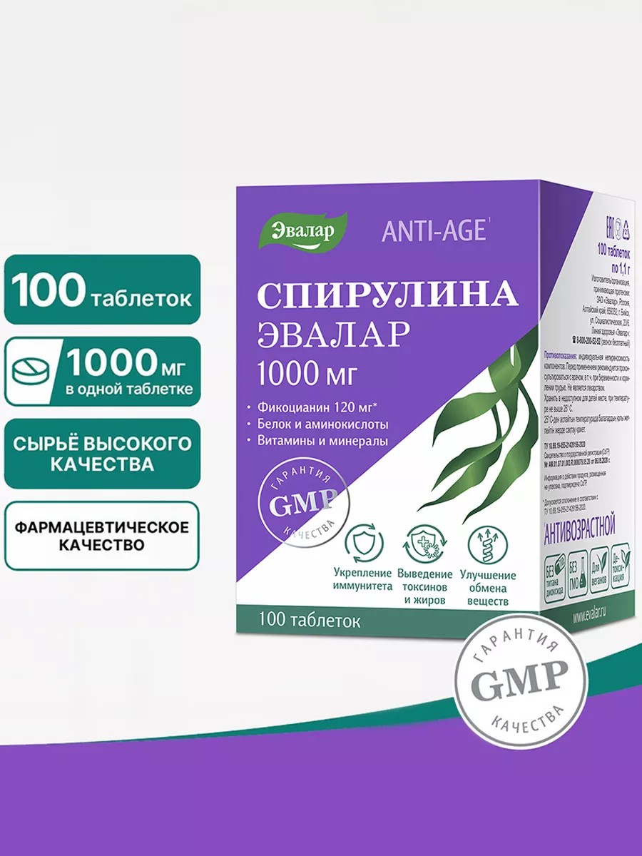 Сине-зеленая водоросль спирулина -единственный на Земле микроорганизм, проживший без изменений сотни миллионов лет благодаря уникальному сбалансированному составу.Спирулина -богатый источник фикоцианина (240% суточной нормы), уникального пигмента с редкими свойствами по восстановлению здоровья.**Кроме того, спирулина содержит:**- свыше 60% высококачественного белка, который содержит все 8 незаменимых аминокислот- комплекс мощных антиоксидантов: хлорофилл, бета-каротин, гамма-линоленовую кислоту- витамины А, Е, биотин, витамины группы В- цинк- пищевые волокна**Спирулина Эвалар способствует:**-укреплению иммунитета-очищению организма от токсинов и жиров-улучшению обмена веществ-снижению уровня холестерина микрофлоры кишечника-повышению стрессоустойчивости-снижению аппетита**Спирулину Эвалар** можно принимать отдельно и включать в комплексные программы детоксикации организма и укрепления иммунитета.