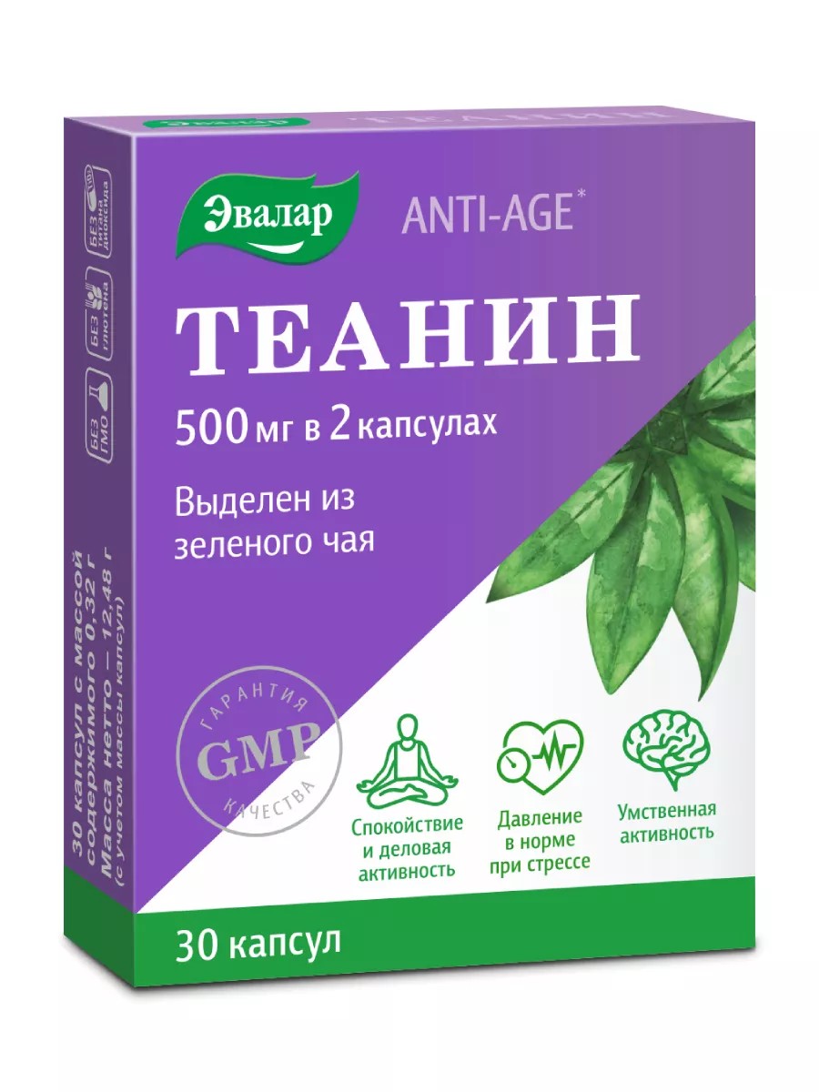 Theanine Evalar is a true brain booster. It contains an optimal dosage of theanine - 500 mg in two capsules. A regular cup of green tea contains only 10-20 mg, which, in fact, increases blood pressure due to the presence of caffeine. Theanine Evalar helps: increase intelligence, business activity, and creative energy; reduce stress; reduce anxiety and irritability; normalize blood pressure due to stress; and improve concentration. Directions: Adults, take 2 capsules daily. Duration of treatment: 1 month. Treatment can be continued if necessary.