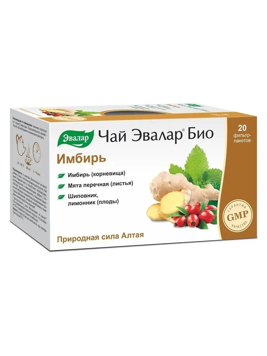 Evalar Bio Ginger Tea has an invigorating taste and promotes a warming, fat-burning, and antiviral effect. It helps: - strengthen the immune system - enhance the body's defenses - reduce the risk of colds - accelerate metabolism - remove excess fluid from the body. Adults take 1 glass 2 times daily. Duration of treatment is 10 days; repeat if necessary.