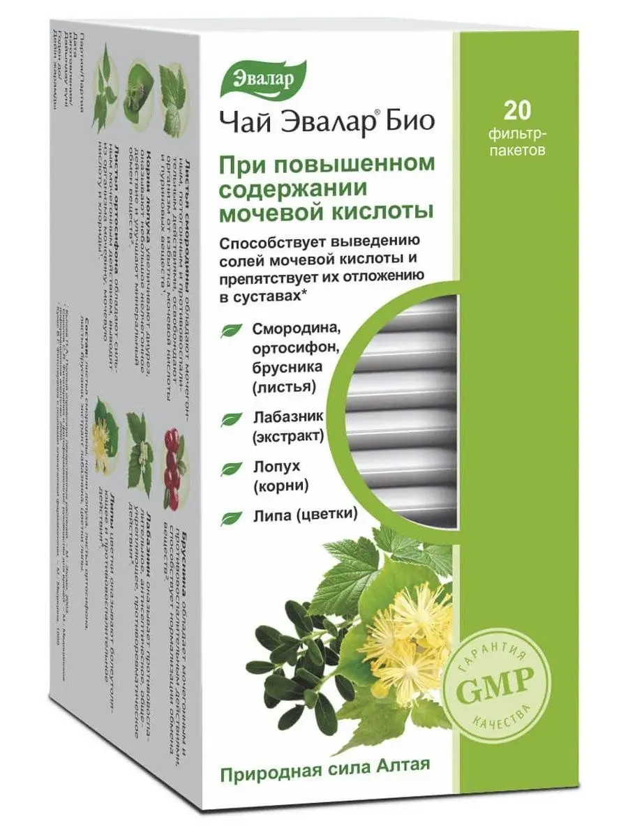Evalar BIO Tea for those with elevated uric acid levels promotes the elimination of uric acid salts and prevents their deposition in the joints.