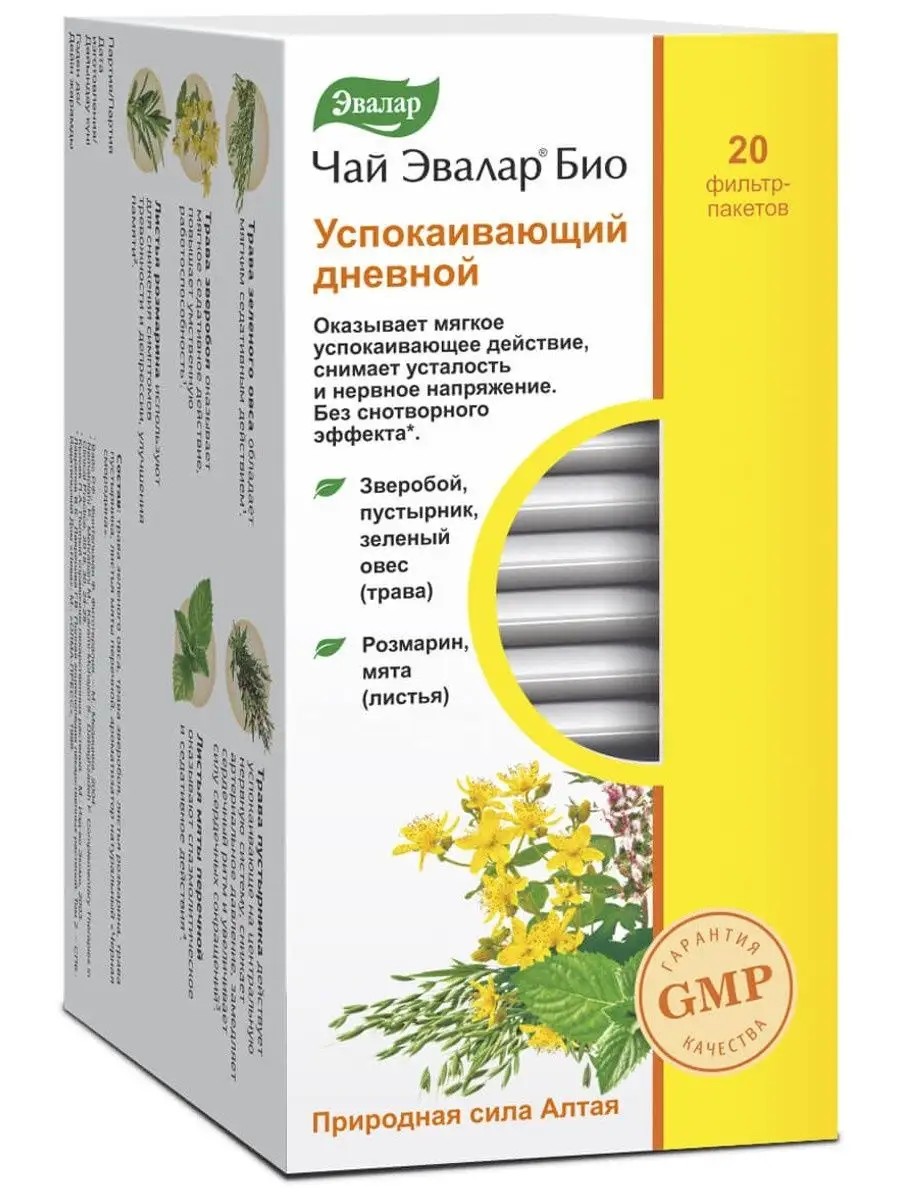 Эвалар БИО чай успокаивающий дневной оказывает мягкое успокаивающее действие, снимает усталость и нервное напряжение, без снотворного эффекта.