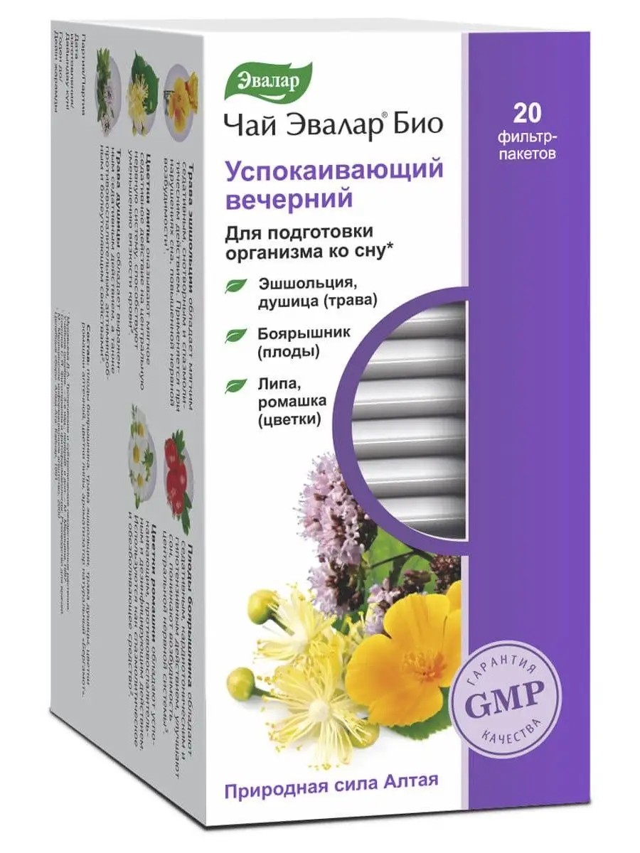 Чай Эвалар БИО успокаивающий вечерний для нормализации эмоционального состояния после рабочего дня.В составе: букет травяных ароматов, сочетающий в себе спокойные и мягкие нотки ромашки и эшшольции, восхитительно душистые цветки липы, приятные сладкие оттенки душицы и пикантный вкус спелых ягод боярышника.Прием 200 мл настоя обеспечивает рекомендуемую суточную норму флавоноидов (5,0 мг) -на 17%.Способ применения: 1 фильтр-пакет залить 1 стаканом кипятка (200 мл), настоять 5-10 минут. Принимать взрослым по 1 стакану за 30-40 минут до сна. Продолжительность приема не менее 20 дней, при необходимости прием можно повторить через 10 дней.