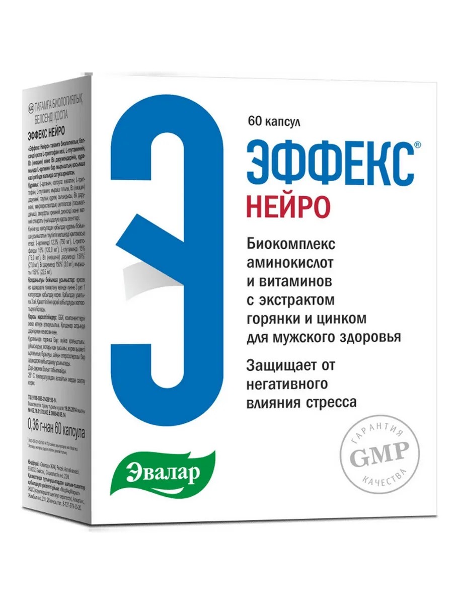 ЭФФЕКС НЕЙРО- биокомплекс для мужчин, способствующий продлению полового акта и улучшению качества секса (комплекс аминокислот, усиленный цинком и экстрактом горянки).В состав входят аминокислоты: L-аргинин, L-глутамин, L-триптофан, экстракт горянки, цинк и витамины B3, В6. В максимальных дозировках, они представляют настоящий коктейль самых полезных веществ для мужской силы, выносливости и полноценной интимной жизни!Благодаря комплексному действию аминокислот, Эффекс Нейро способствует: продлению полового акта и улучшению качества секса; устранению нейрогенной (психологической) причины преждевременной эякуляции; повышению либидо и защите от негативного влияния стресса; улучшению потенции и сперматогенеза.Важно! Продолжительность приема не менее 3-х месяцев. На курс необходимо 5 упаковок.Биологически активная добавка (БАД).Не является лекарственным средством.