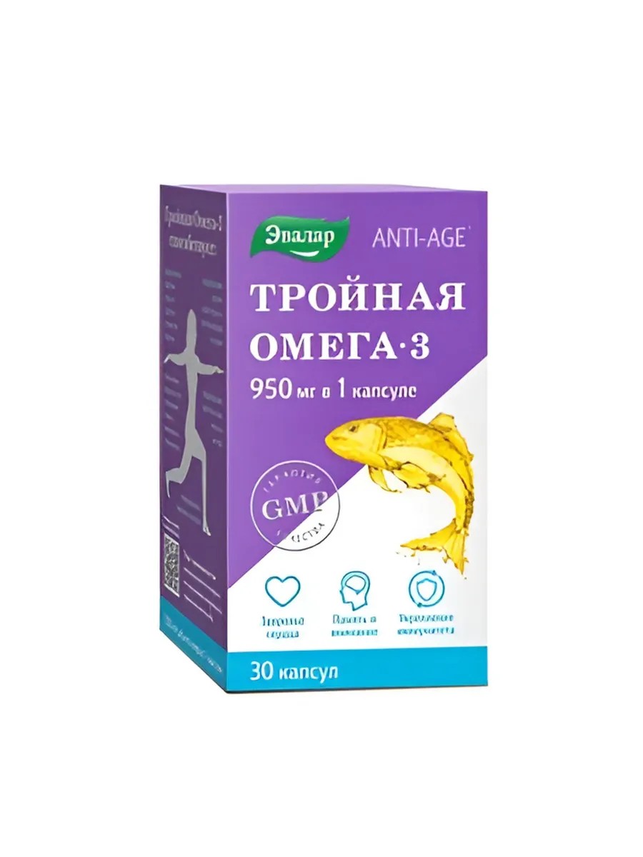 Evalar Triple Omega-3 capsule contains 950 mg, one pack of 30 capsules. Ingredients: fish oil from sardines, anchovy and mackerel (1300 mg in 1 capsule), capsule: gelatin, glycerin (humidifier); mixed tocopherols (antioxidant). : TRIPLE OMEGA-3 - Biologically active food supplement - Maximum 1 omega-3 in each capsule - 950 mg. 3 times stronger than usual. Appearance and properties: Transparent soft gelatin capsule. Capsule contents - light yellow oily liquid. Active ingredient: omega-3 Pronova Pure 500:200 EE, BASF (Norway), including EPA and DHA. Effect: For the heart and blood vessels, vision, joints, brain function, immune system support, and beautiful skin, hair, and nails. Contents per capsule (daily intake) and % of the adequate daily intake. Fish oil 950 mg with an omega-3 PUFA content of at least 1300 mg (47.5%), including: eicosapentaenoic acid (EPA) at least 550 mg (92%); docosahexaenoic acid (DHA) at least 230 mg (33%). Omega-3 polyunsaturated fatty acids (omega-3 PUFAs) are probably well known for their beneficial properties. Since the last century, they have firmly established themselves among the most beneficial foods and still hold a place of honor there. Omega-3s are essential for heart, blood vessel, and brain function, maintaining normal cholesterol levels, joint health, good vision, beautiful skin, hair, and nails, and generally maintaining youth and health. Omega-3s are essential at any age—from infancy, when they should be ingested through breast milk, to old age. When faced with a wide variety of omega-3 supplements, the question arises: which one to choose? Are they all equally beneficial? One of the most advanced omega-3 supplements is Evalar's Triple Omega-3. Evalar's Triple Omega-3 offers: The highest omega-3 dosage in 1 capsule. Evalar's Triple Omega-3 contains 950 mg of essential omega-3 PUFAs (EPA + DHA), instead of the 300 mg found in standard supplements. High-quality raw materials from Norway. Evalar uses the highest-quality fish oil from the world-renowned company BASF (Norway). High purity omega-3. The exceptionally high degree of omega-3 purification exceeds even the requirements of the European Pharmacopoeia. Triple Omega-3 from Evalar offers triple benefits for supporting: heart and vascular health, normal cholesterol levels, a strengthened immune system, memory, attention, learning ability, healthy joints, and beautiful skin, hair, and nails. Just one capsule per day, for those who value quality and ease of use. Suitable for pregnant and breastfeeding women. Competitive price. Triple Omega-3 from Evalar is 50% more affordable. Triple Omega-3 from Evalar offers impeccable quality without overpaying! Omega-3 is a group of polyunsaturated fatty acids vital to our body. In total, this group includes 11 types of fatty acids. Only three are essential (i.e., not produced by the body in sufficient quantities): alpha-linolenic acid (ALA), eicosapentaenoic acid (EPA), and docosahexaenoic acid (DHA). ALA is exclusively plant-based, while EPA and DHA are found in fish oil. Omega-3 for sports. For good athletic performance, a balanced diet is essential. In addition to a high protein intake, vitamins, and trace elements, it's important to include omega-3 fatty acids in your diet. Regular consumption of omega-3s significantly improves protein metabolism, facilitates its absorption, and therefore strengthens muscles. Furthermore, one of the causes of muscle breakdown is inflammation, which omega-3s combat. Because omega-3s help form cell membranes, they help maintain the elasticity of tendons, ligaments, and cartilage, improve joint lubrication, and slow the breakdown of collagen fibers. Omega-3s lower "bad" cholesterol, protect blood vessels and capillaries, and maintain overall body tone, which helps increase endurance during training. Omega-3 fatty acids also promote faster recovery after physical activity and injury. Therefore, if you exercise, take Evalar's Omega-3s for better results and health. Special features: Sugar-free, GMO-free, and gluten-free. Indications: For sale to the general population as a dietary supplement - an additional source of omega-3 polyunsaturated fatty acids (eicosapentaenoic acid and docosahexaenoic acid), including for pregnant and lactating women. Contraindications: Individual intolerance to the components. It is recommended to consult a doctor before use. Dosage and administration: Adults take 1 capsule once daily with meals. Duration of use: 1 month. Repeat if necessary. Special instructions. Dietary supplement. Not a medicine. Consult a physician before use. Store between 2°C and 25°C.