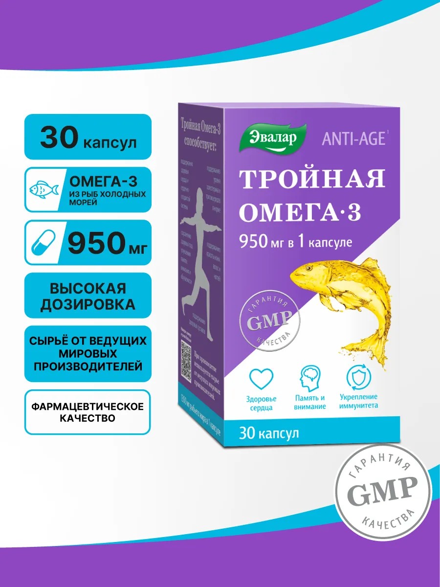 Эвалар Тройная Омега 3 950 мг, рыбий жир, 30 капсул