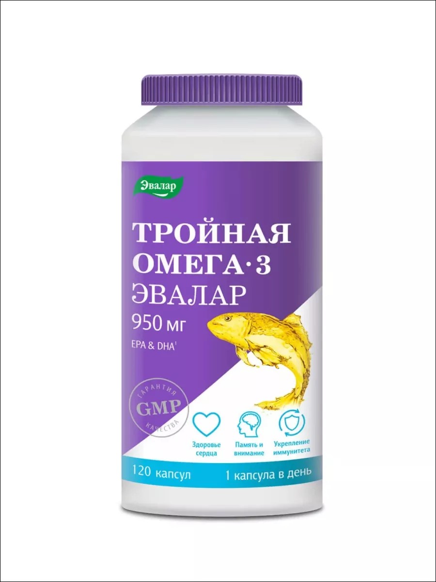 Эвалар Тройная Омега 3, 950мг, рыбий жир в капсулах 120 шт