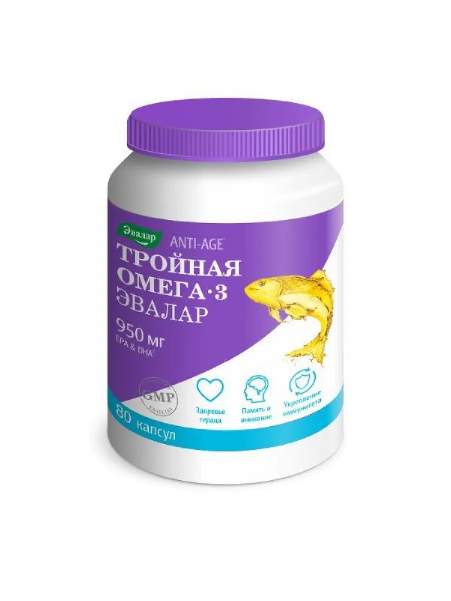 Своими полезными свойствами полиненасыщенные жирные кислоты омега-3 (ПНЖК омега-3) известны, пожалуй, всем. Начиная с прошлого века, они прочно вошли в список самых полезных продуктов и до сих пор занимают там свое почетное место. Омега-3 чрезвычайно важны для работы сердца, сосудов и мозга, поддержания в норме уровня холестерина, здоровья суставов, хорошего зрения, красоты кожи, волос и ногтей и в целом для сохранения молодости и здоровья. Омега-3 важны в любом возрасте - от младенчества, когда они должны поступать с молоком матери, до преклонных лет.Омега-3 - группа полиненасыщенных жирных кислот, жизненно необходимых нашему организму. Всего в эту группу входит 11 разновидностей жирных кислот. Незаменимыми (не вырабатываются организмом в нужном объеме) являются лишь три:- альфа-линоленовая (АЛК);- эйкозапентаеновая кислота (ЭПК);- докозагексаеновая (ДГК).АЛК является кислотой только растительного происхождения. А кислоты ЭПК и ДГК содержатся в рыбьем жире.Когда сталкиваешься с большим разнообразием препаратов омега-3, возникает вопрос, какой из них выбрать? Все ли они одинаково полезны? Одним из самых совершенных препаратов омега-3 можно назвать Тройную Омега-3 Эвалар.Тройная Омега-3 Эвалар - это:Самая высокая* дозировка омега-3 в 1 капсуле. Тройная Омега-3 Эвалар содержит 950 мг незаменимых ПНЖК Омега-3 (ЭПК + ДГК), вместо 300 мг, как в обычных.Качественное сырье из Норвегии. Эвалар использует рыбий жир высочайшего качества от компании с мировым именем BASF (Норвегия).Высокая чистота омега-3. Исключительно высокая степень очистки Омега-3 превышает требования даже европейской фармакопеи.Тройная Омега-3 Эвалар - это тройная польза для поддержания:- здоровья сердца и сосудов;- уровня холестерина в норме;- укрепления иммунитета;- памяти, внимания, способности к обучению;- суставов;- красоты кожи, волос, ногтей.Всего 1 капсула в день, для тех, кто ценит качество и удобство приема.Разрешена беременным и кормящим женщинам.* В ассортименте ЗАО "Эвалар".