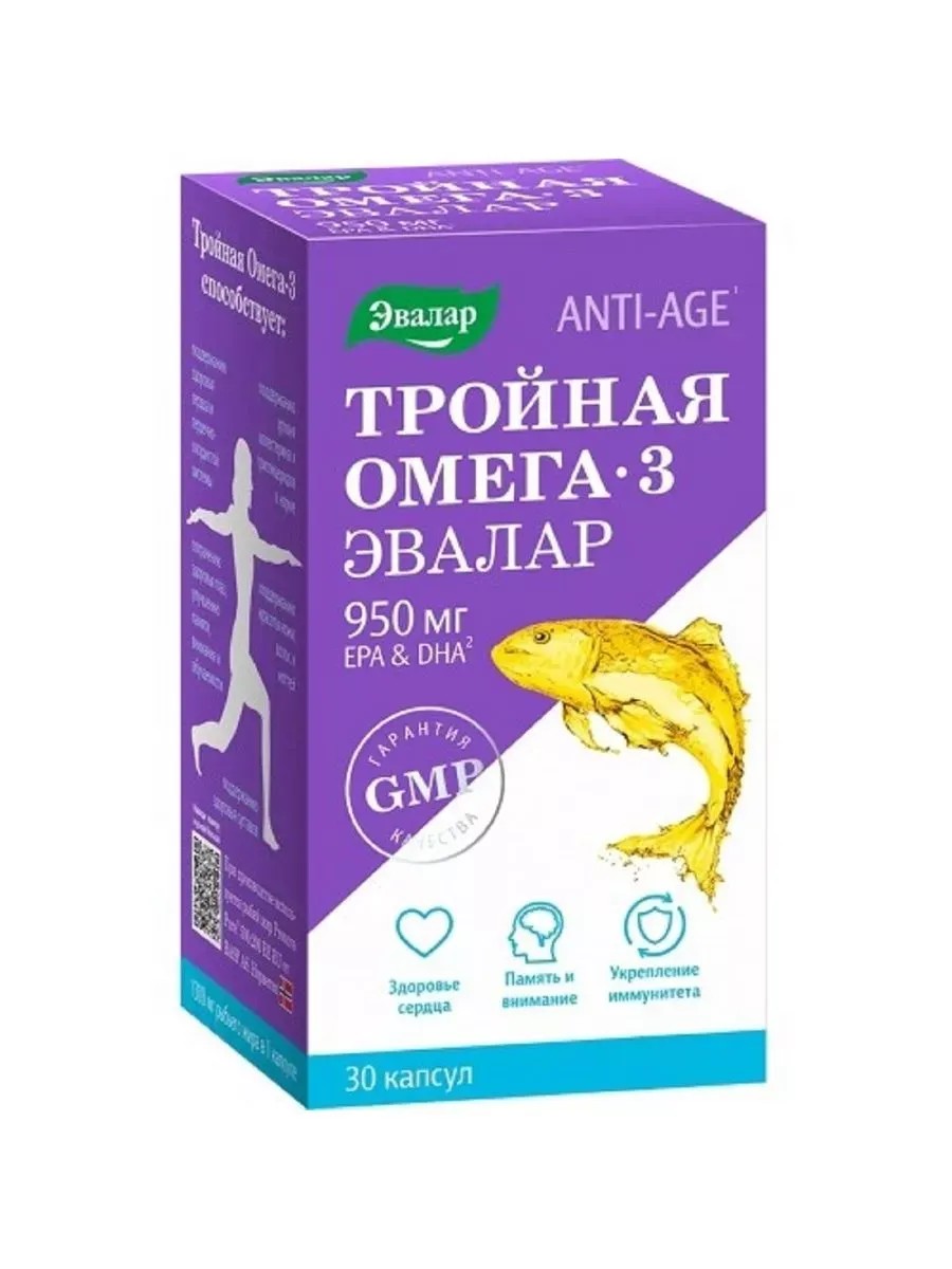 Тройная Омега 3 - это биологически активная добавка (БАД) к пище, которая содержит мощный комплекс жирных кислот Омега 3, необходимых для здорового функционирования нашего организма. Каждая капсула содержит 950 мг Омега 3 и имеет общую массу 1300 мг. Продукт произведен из натуральных компонентов, не содержит искусственных добавок, консервантов или красителей. Регулярное употребление Тройной Омеги 3 помогает укрепить сердечно-сосудистую систему, улучшить кровообращение, обеспечить нормальный уровень холестерина в крови, а также укрепить иммунную систему и нервную систему. Этот продукт рекомендуется для всех людей, которые следят за своим здоровьем и хотят поддержать организм на высоком уровне.Для получения хороших результатов в спорте необходима корректировка рациона питания. Помимо большого количества белка, витаминов и микроэлементов, в рацион важно добавить омега-3 жирные кислоты. Регулярное употребление омега-3 значительно улучшает метаболизм белка, помогает ему легче усвоиться, а значит, укреплять мышцы. Кроме того, одной из причин разрушения мышц является воспаление, с которым борется омега-3.Так как омега-3 жирные кислоты участвуют в формировании клеточных мембран, то за счет этого они позволяют сохранять эластичность сухожилий, связок, хрящей, способствуют улучшению свойств внутрисуставной смазки, замедляют распад коллагеновых волокон. Омега-3 снижают уровень «плохого» холестерина, защищают сосуды и капилляры, поддерживают общий тонус организма, что помогает повысить выносливость на тренировках.Кроме того, омега-3 жирные кислоты обеспечивают более быстрое восстановление после физических нагрузок и травм. Поэтому, если вы занимаетесь спортом принимайте омега-3 от компании «Эвалар» для лучших результатов и поддержания здоровья