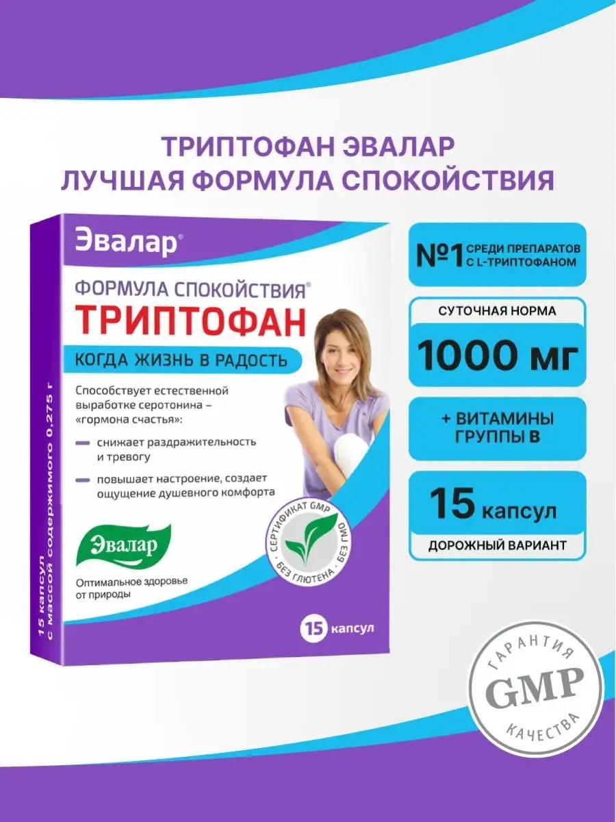 Формула спокойствия Антистресс Триптофан от Эвалар способствует синтезу в организме серотонина и мелатонина, поддерживает нормальный цикл "сон-бодрствование", в том числе помогает адаптироваться к смене часовых поясов-Днем способствует естественной выработке серотонина- "гормона счастья", создает ощущение приподнятого настроения и душевного комфорта, повышает работоспособность, снижает раздражительность, агрессивность,снижает уровень стресса устраняет подавленное настроение, чувство тревоги, эмоционального напряжения.-Ночью способствует естественной выработке мелатонина -"гормона сна", помогает легко и быстро заснуть, улучшает глубину и качество сна, способствует устранению проблемы прерывистого сна, позволяя полноценно выспаться и отдохнуть за более короткое время. Преимущества:-Оптимальное содержание аминокислоты L-триптофан (500 мг в 2 капсулах)-Действие L-триптофана усилено витаминами В5,