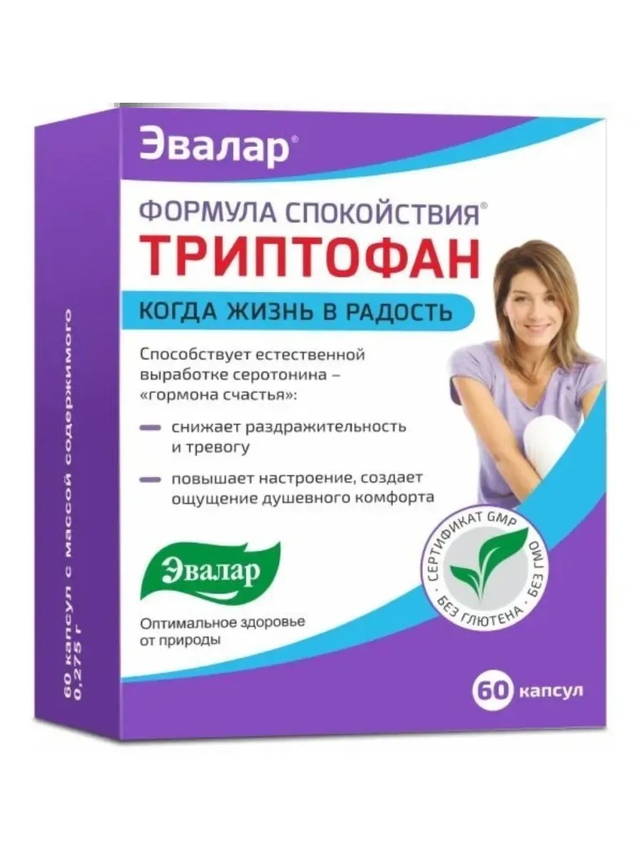 Формула спокойствия Триптофан: • Способствует синтезу в организме серотонина и мелатонина, поддерживает нормальный цикл «сон-бодрствование», в том числе помогает адаптироваться к смене часовых поясов (при перелетах). • Днем способствует естественной выработке серотонина – «гормона счастья», создает ощущение приподнятого настроения и душевного комфорта, повышает работоспособность, снижает раздражительность, агрессивность, устраняет подавленное настроение, чувство тревоги, эмоционального напряжения. • Ночью способствует естественной выработке мелатонина – «гормона сна», помогает легко и быстро заснуть, улучшает глубину и качество сна, способствует устранению проблемы прерывистого сна, позволяя полноценно выспаться и отдохнуть за более короткое время. Преимущества:-Оптимальное содержание аминокислоты L-триптофан (500 мг в 2 капсулах)-Действие L-триптофана усилено витаминами В5, В6-Гарантированно высокое качество: произведен по международному стандарту GMP-Как работают ингредиенты:-L-триптофан – незаменимая аминокислота, входящая в состав белков всех известных живых организмов Попадая в организм L-триптофан претерпевает цепочку преобразований, на одном из этапов которой из него образуется серотонин. Без триптофана выработка серотонина в организме не произойдет. Для этого процесса также необходимо наличие дневного света. Серотонин оказывает влияние на функции различных органов и тканей. В центральной нервной системе серотонин играет роль медиатора синаптической передачи нервных импульсов. Он участвует в регуляции общего уровня активности центральной нервной системы, циклов сна — бодрствования, общей двигательной активности, разных форм эмоционального поведения, процессов памяти и обучения. Оптимальный уровень серотонина в организме формирует ощущение приподнятого настроения, эмоционального комфорта, радости, счастья. Серотонин повышает умственную работоспособность, стимулирует познавательную активность, повышает самооценку, помогает сохранять самообладание в стрессовых ситуациях. Также он улучшает физическую работоспособность, повышает силовые показатели и выносливость, что может вести к увеличению длительности тренировки из-за изменения субъективного восприятия степени усталости. Доказано, что у людей в подавленном и депрессивном состоянии уровень серотонина крайне низок. С наступлением темного времени суток цепочка преобразований L-триптофана в организме продолжается, и из полученного серотонина образуется мелатонин – физиологический регулятор сна, который способствует его наступлению, регулирует фазы сна и их продолжительность.-Пантотеновая кислота (витамин В5) – «антистрессовый витамин». К проявлениям его недостатка в организме относятся усталость, расстройство сна, повышенная утомляемость и раздражительность.--Пиридоксин (витамин В6) важен для поддержания функций центральной и периферической нервной системы, участвует в синтезе серотонина и обмене триптофана.-